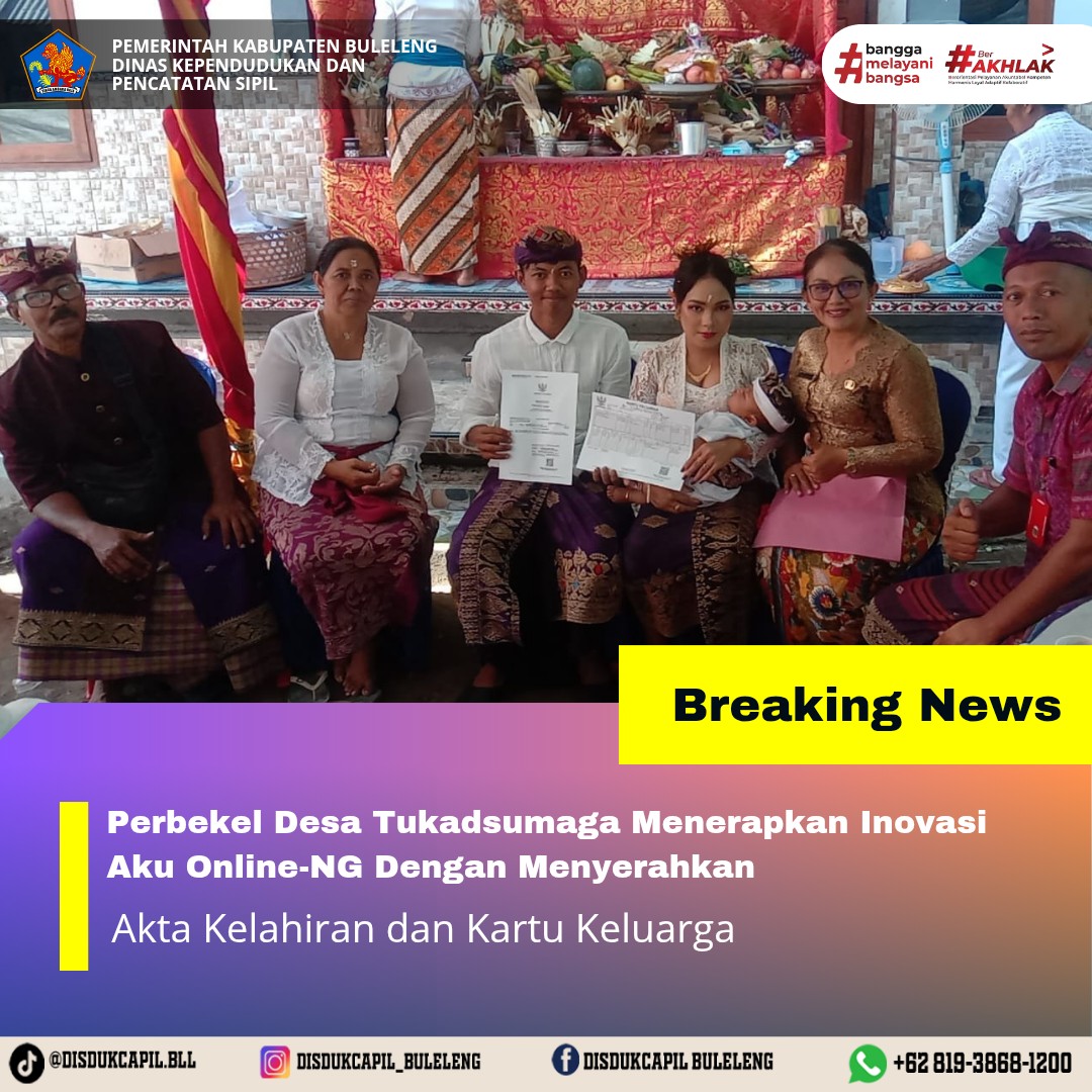 Pemerintah Kabupaten Buleleng melalui Dinas Kependudukan dan Pecatatan Sipil (Disdukcapil) Kabupaten Buleleng memaksimalkan serta mempermudah pelayanan kependudukan masyarakat dengan beberapa inovasi, melalui aplikasi AKU Online. Dimana dalam penerapan aplikasi Aku Online tersebut masyarakat tidak perlu lagi datang ke Dinas Dukcapil untuk melakukan pelayanan langsung cukup dengan datang ke Desa nanti akan dibantu oleh operator Desa masing-masing. Di Desa Tukadsumaga Kecamatan Gerokgak telah diserahkan dokumen kependudukan berupa Akta Kelahiran atas nama I Putu Aditya Masdinanta dan Kartu Keluarga atas nama I Komang Ari Pebriananta warga Banjar Dinas Gandongan Cendana Desa Tukadsumaga oleh Perbekel Desa Tukadsumaga Anak Agung Sri Wathi, Desa Tukadsumaga, Kecamatan Gerokgak, Rabu (24/9).