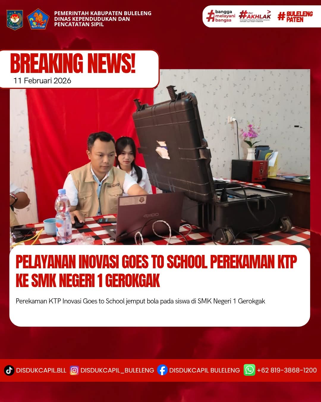 Pada kali ini Rabu, 11 Februari 2026 pelayanan perekaman KTP-el dilaksanakan di SMK Negeri 1 Gerokgak. Hasil perekaman di SMK Negeri 1 Gerokgak dengan data BNBA sebanyak 314 orang dan total yang melakukan perekaman sebanyak 87 orang, dimana hasil perekaman data di dalam BNBA sebanyak 80 orang dan data di luar BNBA sebanyak 7 orang yang melakukan perekaman. Dilihat dari hasil tersebut sisa data BNBA yang belum perekaman sebanyak 234 orang keterangan dari pihak sekolah siswa yang belum perekaman dilanjutkan di hari selanjutnya.