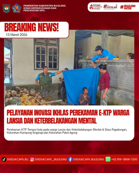 Pada hari ini Jumat, 13 Maret 2026 Dinas Kependudukan dan Pencatatan Sipil Kabupaten Buleleng melaksanakan penerapan Inovasi Ikhlas dengan melakukan jemput bola kepada masyarakat untuk melakukan perekaman KTP-El kepada warga Lansia dan Keterbelakangan Mental di Desa Pegadungan, Kelurahan Kampung Singaraja dan Kelurahan Paket Agung atas nama :