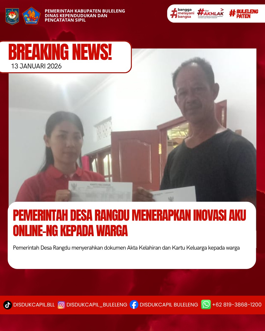 Pemerintah Kabupaten Buleleng melalui Dinas Kependudukan dan Pecatatan Sipil (Disdukcapil) Kabupaten Buleleng memaksimalkan serta mempermudah pelayanan kependudukan masyarakat dengan beberapa inovasi, melalui aplikasi AKU Online. Dimana dalam penerapan aplikasi Aku Online tersebut masyarakat tidak perlu lagi datang ke Dinas Dukcapil untuk melakukan pelayanan langsung cukup dengan datang ke Desa nanti akan dibantu oleh operator Desa masing-masing. Di Desa Rangdu Kecamatan Seririt telah diserahkan dokumen kependudukan berupa Akta Kelahiran atas nama I Kadek Aryarama Giandra dan Kartu Keluarga atas nama I Putu Widiadnyana yang diserahkan oleh Operator Desa Rangdu Kecamatan Seririt, Selasa (13/1).