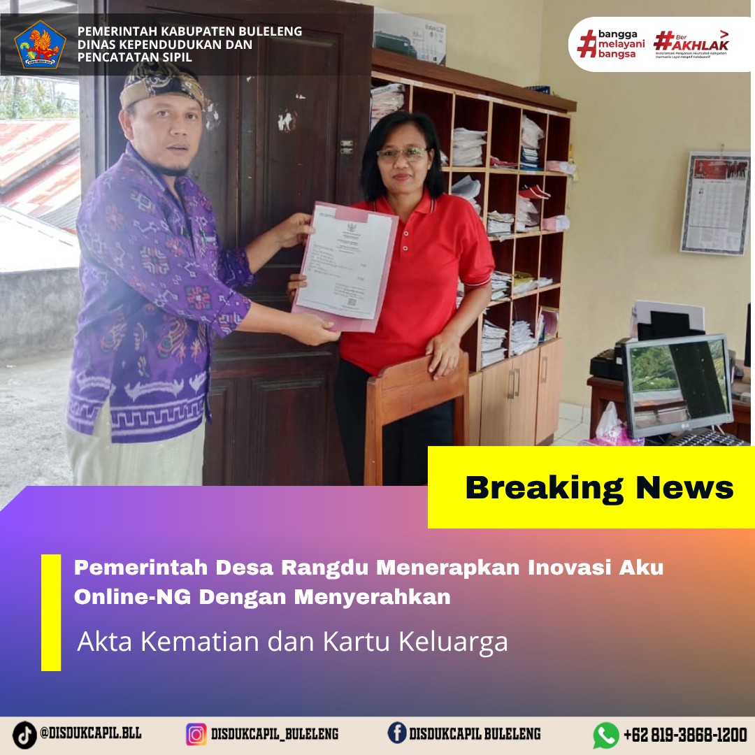 Pemerintah Kabupaten Buleleng melalui Dinas Kependudukan dan Pecatatan Sipil (Disdukcapil) Kabupaten Buleleng memaksimalkan serta mempermudah pelayanan kependudukan masyarakat dengan beberapa inovasi, melalui aplikasi AKU Online. Dimana dalam penerapan aplikasi Aku Online tersebut masyarakat tidak perlu lagi datang ke Dinas Dukcapil untuk melakukan pelayanan langsung cukup dengan datang ke Desa nanti akan dibantu oleh operator Desa masing-masing. Di Desa Rangdu Kecamatan Seririt telah diserahkan dokumen kependudukan berupa Akta Kematian atas nama Nyoman Pageh Yadnya dan Kartu Keluarga atas nama Nyoman Suprapti Dewi yang diserahkan oleh Kelian Banjar Dinas Kerta Nadi Desa Rangdu Kecamatan Seririt, Kamis (30/10).