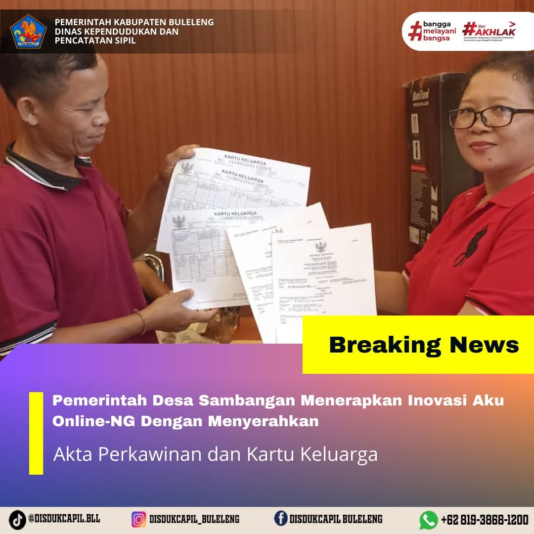 Pemerintah Kabupaten Buleleng melalui Dinas Kependudukan dan Pecatatan Sipil (Disdukcapil) Kabupaten Buleleng memaksimalkan serta mempermudah pelayanan kependudukan masyarakat dengan beberapa inovasi, melalui aplikasi AKU Online-NG. Dimana dalam penerapan aplikasi Aku Online-NG tersebut masyarakat tidak perlu lagi datang ke Dinas Dukcapil untuk melakukan pelayanan langsung cukup dengan datang ke Desa nanti akan dibantu oleh operator Desa masing-masing. Di Desa Sambangan Kecamatan Sukasada, telah diserahkan dokumen kependudukan berupa Akta Perkawinan atas nama Komang Susila dan 3 Kartu Keluarga atas nama Komang Susila, Made Darma dan Ketut Marta Yasa yang diserahkan oleh Kasi Pemerintahan Desa Sambangan kepada warga Banjar Dinas Banjar Anyar bertempat di Kantor Perbekel Desa Sambangan, Kecamatan Sukasada, Kabupaten Buleleng, Jumat (12/12).