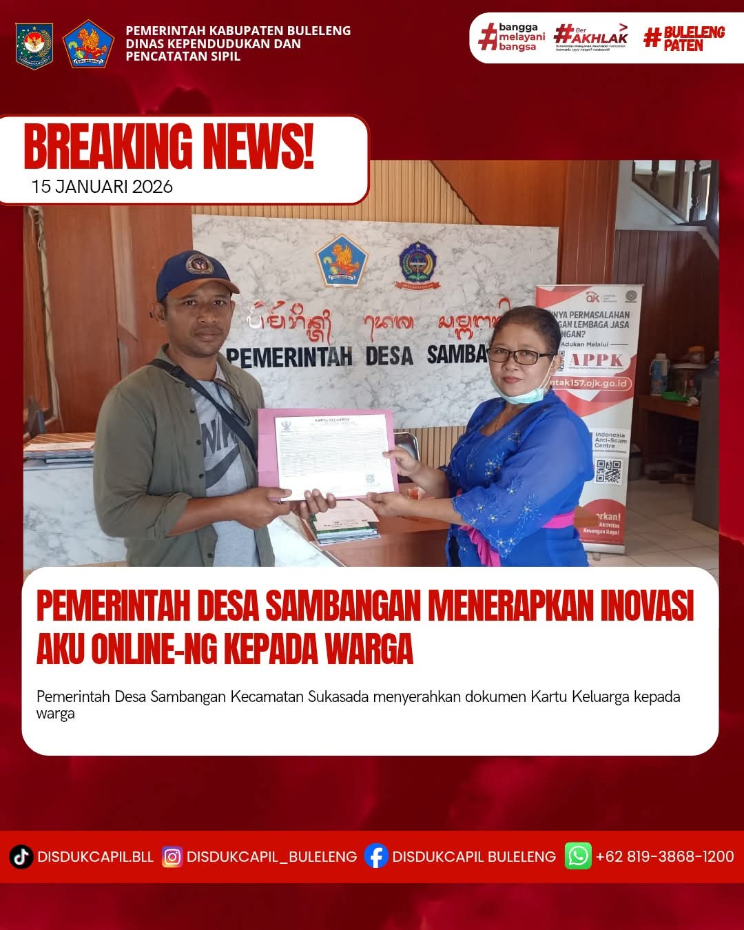 Pemerintah Kabupaten Buleleng melalui Dinas Kependudukan dan Pecatatan Sipil (Disdukcapil) Kabupaten Buleleng memaksimalkan serta mempermudah pelayanan kependudukan masyarakat dengan beberapa inovasi, melalui aplikasi AKU Online-NG. Dimana dalam penerapan aplikasi Aku Online-NG tersebut masyarakat tidak perlu lagi datang ke Dinas Dukcapil untuk melakukan pelayanan langsung cukup dengan datang ke Desa nanti akan dibantu oleh operator Desa masing-masing. Di Desa Sambangan Kecamatan Sukasada, telah diserahkan dokumen kependudukan berupa Kartu Keluarga atas nama Ketut Astina Yasa dengan Nyoman Tirta warga Banjar Dinas Sambangan diserahkan oleh Kasi Pemerintahan Desa Sambangan bertempat di Kantor Perbekel Desa Sambangan, Kecamatan Sukasada, Kabupaten Buleleng, Kamis (15/1).