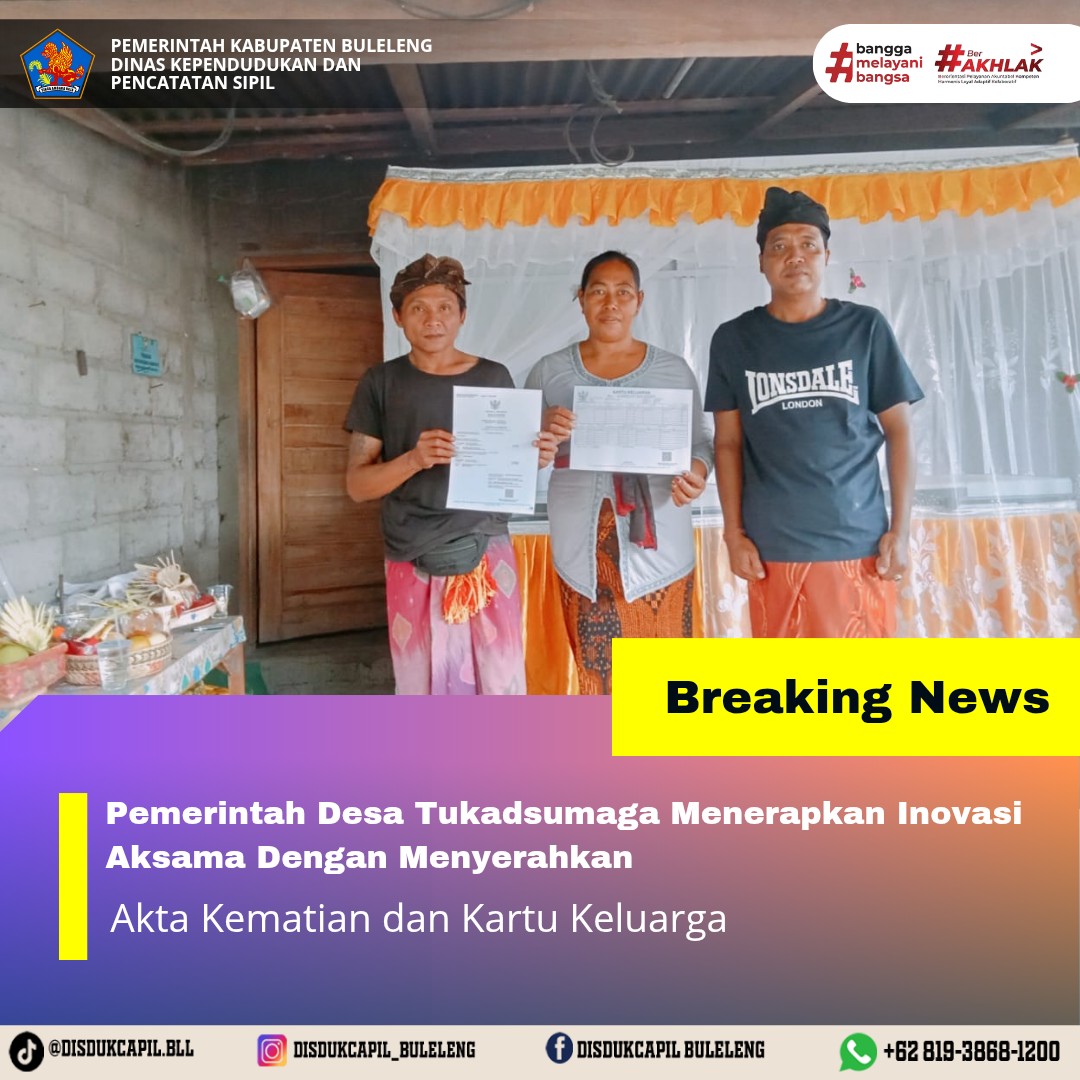 Pemerintah Kabupaten Buleleng melalui Dinas Kependudukan dan Pecatatan Sipil (Disdukcapil) Kabupaten Buleleng memaksimalkan serta mempermudah pelayanan kependudukan masyarakat dengan beberapa inovasi, yakni BALITA (Bayi Lahir Berakta), NYAKSI (Menyerahkan Akta Kawin Saat Acara Perkawinan) dan AKSAMA ( Akta Kematian Diserahkan Saat Masih Berduka) melalui aplikasi Aku Online. Di Desa Tukadsumaga Kecamatan Gerokgak, telah diterapkan program Aksama (Akta Kematian Diserahkan Saat Masih Berduka) yang dilakukan secara langsung oleh Kelian Banjar Dinas Yehmas Desa Tukadsumaga dengan menyerahkan Akta Kematian atas nama I KETUT REPEN dan Kartu Keluarga atas nama NI MADE LASTI kepada pihak keluarga almarhum di Desa Tukadusumaga Kecamatan Gerokgak, Minggu (25/10).