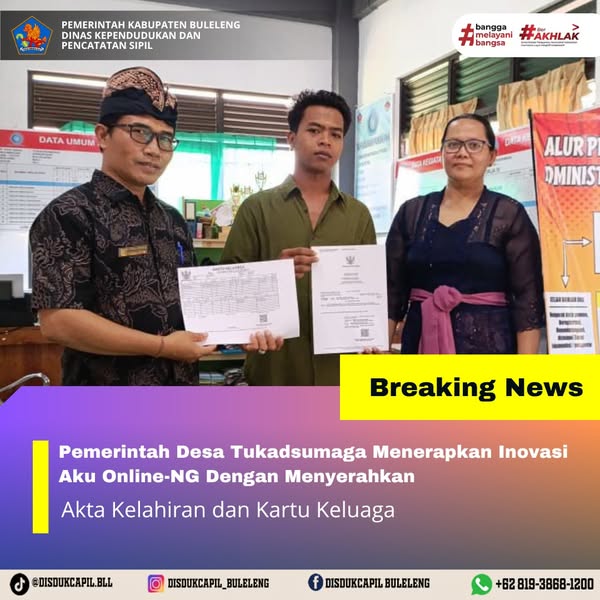 Pemerintah Kabupaten Buleleng melalui Dinas Kependudukan dan Pecatatan Sipil (Disdukcapil) Kabupaten Buleleng memaksimalkan serta mempermudah pelayanan kependudukan masyarakat dengan beberapa inovasi, melalui aplikasi AKU Online. Dimana dalam penerapan aplikasi Aku Online tersebut masyarakat tidak perlu lagi datang ke Dinas Dukcapil untuk melakukan pelayanan langsung cukup dengan datang ke Desa nanti akan dibantu oleh operator Desa masing-masing. Di Desa Tukadsumaga Kecamatan Gerokgak telah diserahkan dokumen kependudukan berupa Akta Kelahiran atas nama Luh Kinan Sintya Dewi dan Kartu Keluarga yang diserahkan oleh Pemerintahan Desa Tukadsumaga Kecamatan Gerokgak, Kamis (16/10).