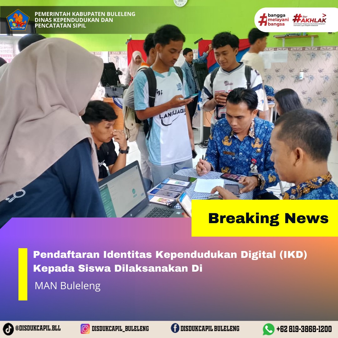 Menerapkan aturan pemerintah tersebut, Dinas Kependudukan dan Pencatatan Sipil Kabupaten Buleleng menyelenggarakan Pendaftaran Identitas Kependudukan Digital ke sekolah-sekolah, Dinas, Lembaga dan Perusahaan secara bergilir setiap harinya. Kali ini pelaksanaan pendaftaran Identitas Kependudukan Digital kepada siswa yang dilaksanakan di MAN Buleleng Desa Patas, Rabu (17/12).