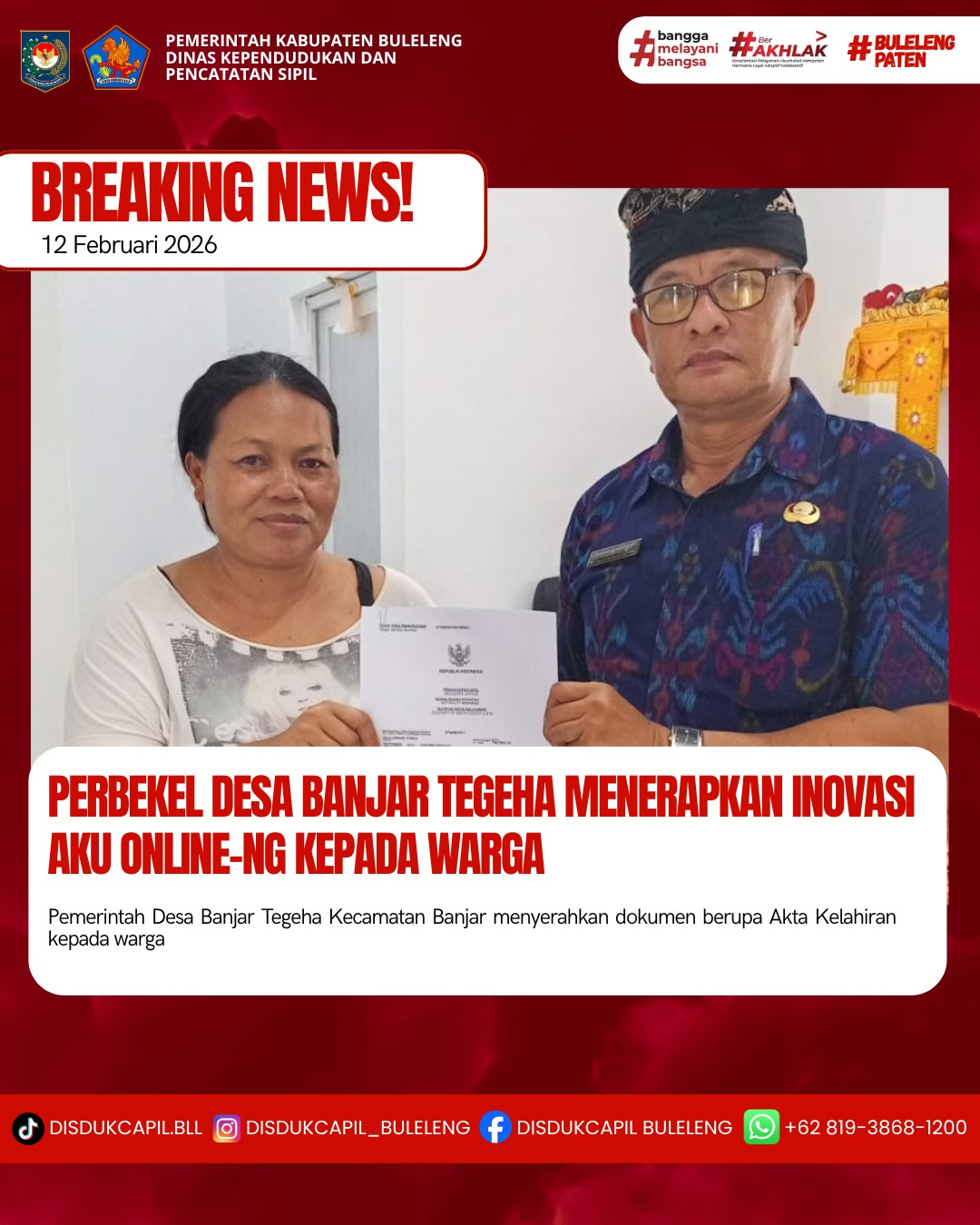 Pemerintah Kabupaten Buleleng melalui Dinas Kependudukan dan Pecatatan Sipil (Disdukcapil) Kabupaten Buleleng memaksimalkan serta mempermudah pelayanan kependudukan masyarakat dengan beberapa inovasi, melalui aplikasi AKU Online-NG. Dimana dalam penerapan aplikasi Aku Online-NG tersebut masyarakat tidak perlu lagi datang ke Dinas Dukcapil untuk melakukan pelayanan langsung cukup dengan datang ke Desa nanti akan dibantu oleh operator Desa masing-masing. Di Desa Banjar Tegeha Kecamatan Banjar, telah diserahkan dokumen kependudukan berupa Akta Kelahiran atas nama Kadek Dita Lokahita yang diserahkan secara langsung oleh Perbekel Desa Banjar Tegeha Ida Bagus Komang Sistiadi, Kamis (12/2).