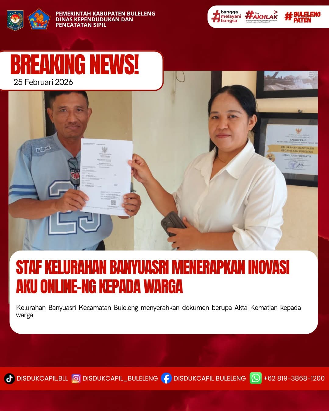 Pemerintah Kabupaten Buleleng melalui Dinas Kependudukan dan Pecatatan Sipil (Disdukcapil) Kabupaten Buleleng memaksimalkan serta mempermudah pelayanan kependudukan masyarakat dengan beberapa inovasi, melalui aplikasi AKU Online-NG. Dimana dalam penerapan aplikasi Aku Online-NG tersebut masyarakat tidak perlu lagi datang ke Dinas Dukcapil untuk melakukan pelayanan langsung cukup dengan datang ke Desa nanti akan dibantu oleh operator Desa masing-masing. Di Kelurahan Banyuning Kecamatan Buleleng, telah diserahkan dokumen kependudukan berupa Akta Kematian warga Kelurahan Banyuning atas nama Abdul Kadir yang diserahkan langsung oleh staf Kelurahan Banyuning Kecamatan Buleleng, Kabupaten Buleleng, Rabu (25/2).