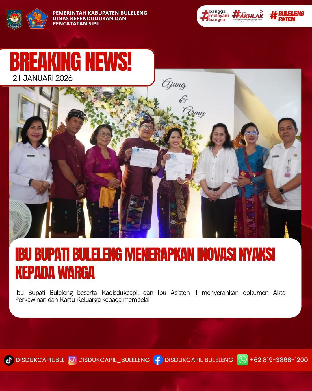 Pemerintah Kabupaten Buleleng melalui Dinas Kependudukan dan Pecatatan Sipil (Disdukcapil) Kabupaten Buleleng memaksimalkan serta mempermudah pelayanan kependudukan masyarakat dengan beberapa inovasi, yakni BALITA (Bayi Lahir Berakta), NYAKSI (Menyerahkan Akta Kawin Saat Acara Perkawinan) dan AKSAMA ( Akta Kematian Diserahkan Saat Masih Berduka) melalui aplikasi Aku Online-NG. Di Desa Baktiseraga Kecamatan Buleleng, telah diterapkan program NYAKSI (Menyerahkan Akta Kawin Saat Acara Perkawinan) yang dilakukan secara langsung oleh Ibu Bupati Buleleng Ny. Wardhany Sutjidra didampingi oleh Ibu Asisten II Putu Ayu Reika Nurhaeni dan Kadisdukcapil Made Juartawan, S.STP, MM dengan menyerahkan Akta Perkawinan dan Kartu Keluarga kepada kedua mempelai dan Kartu Keluarga mempelai dan masing-masing orang tua mempelai, Rabu (21/1).