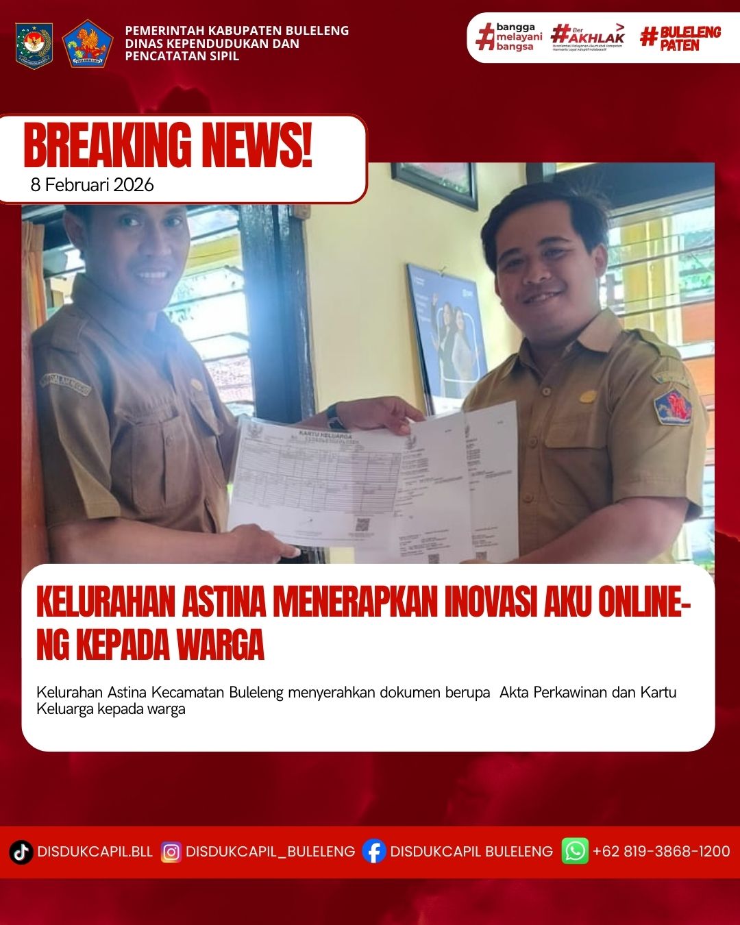 Pemerintah Kabupaten Buleleng melalui Dinas Kependudukan dan Pecatatan Sipil (Disdukcapil) Kabupaten Buleleng memaksimalkan serta mempermudah pelayanan kependudukan masyarakat dengan beberapa inovasi, melalui aplikasi AKU Online-NG. Dimana dalam penerapan aplikasi Aku Online-NG tersebut masyarakat tidak perlu lagi datang ke Dinas Dukcapil untuk melakukan pelayanan langsung cukup dengan datang ke Desa nanti akan dibantu oleh operator Desa masing-masing. Di Kelurahan Astina Kecamatan Buleleng, telah diserahkan dokumen kependudukan berupa Akta Perkawinan dan Kartu Keluarga yang diserahkan langsung oleh Kelurahan Astina Kecamatan Buleleng, Kabupaten Buleleng, Senin (9/2).