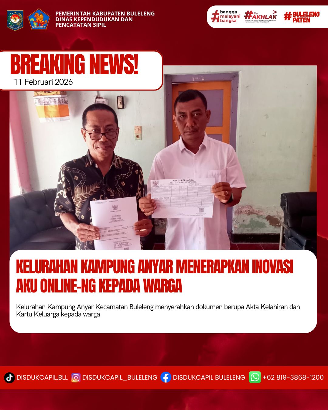 Pemerintah Kabupaten Buleleng melalui Dinas Kependudukan dan Pecatatan Sipil (Disdukcapil) Kabupaten Buleleng memaksimalkan serta mempermudah pelayanan kependudukan masyarakat dengan beberapa inovasi, melalui aplikasi AKU Online-NG. Dimana dalam penerapan aplikasi Aku Online-NG tersebut masyarakat tidak perlu lagi datang ke Dinas Dukcapil untuk melakukan pelayanan langsung cukup dengan datang ke Desa nanti akan dibantu oleh operator Desa masing-masing. Di Kelurahan Kampung Anyar Kecamatan Buleleng, telah diserahkan dokumen kependudukan berupa Akta Kelahiran dan Kartu Keluarga atas nama Imam Buhori yang diserahkan langsung oleh Kelurahan Kampung Anyar Kecamatan Buleleng, Kabupaten Buleleng, Rabu (11/2).