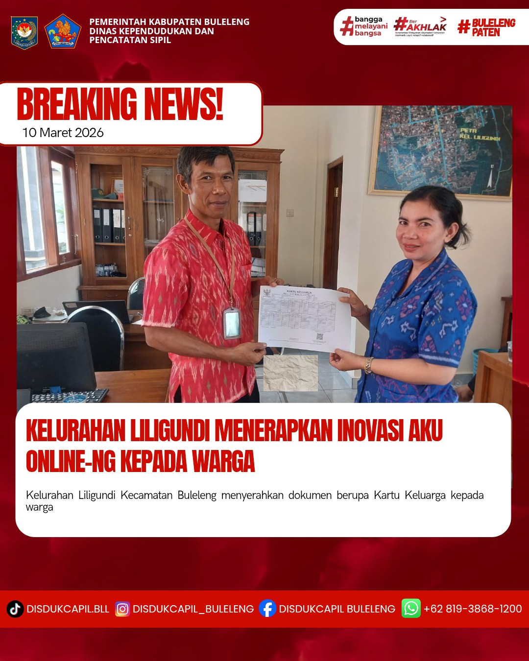 Pemerintah Kabupaten Buleleng melalui Dinas Kependudukan dan Pecatatan Sipil (Disdukcapil) Kabupaten Buleleng memaksimalkan serta mempermudah pelayanan kependudukan masyarakat dengan beberapa inovasi, melalui aplikasi AKU Online-NG. Dimana dalam penerapan aplikasi Aku Online-NG tersebut masyarakat tidak perlu lagi datang ke Dinas Dukcapil untuk melakukan pelayanan langsung cukup dengan datang ke Desa nanti akan dibantu oleh operator Desa masing-masing. Di Kelurahan Liligundi Kecamatan Buleleng, telah diserahkan dokumen kependudukan berupa Kartu Keluarga atas nama Ketut Suwartawan warga Kelurahan Liligundi yang diserahkan langsung oleh Kelurahan Liligundi Kecamatan Buleleng, Kabupaten Buleleng, Selasa (10/3).