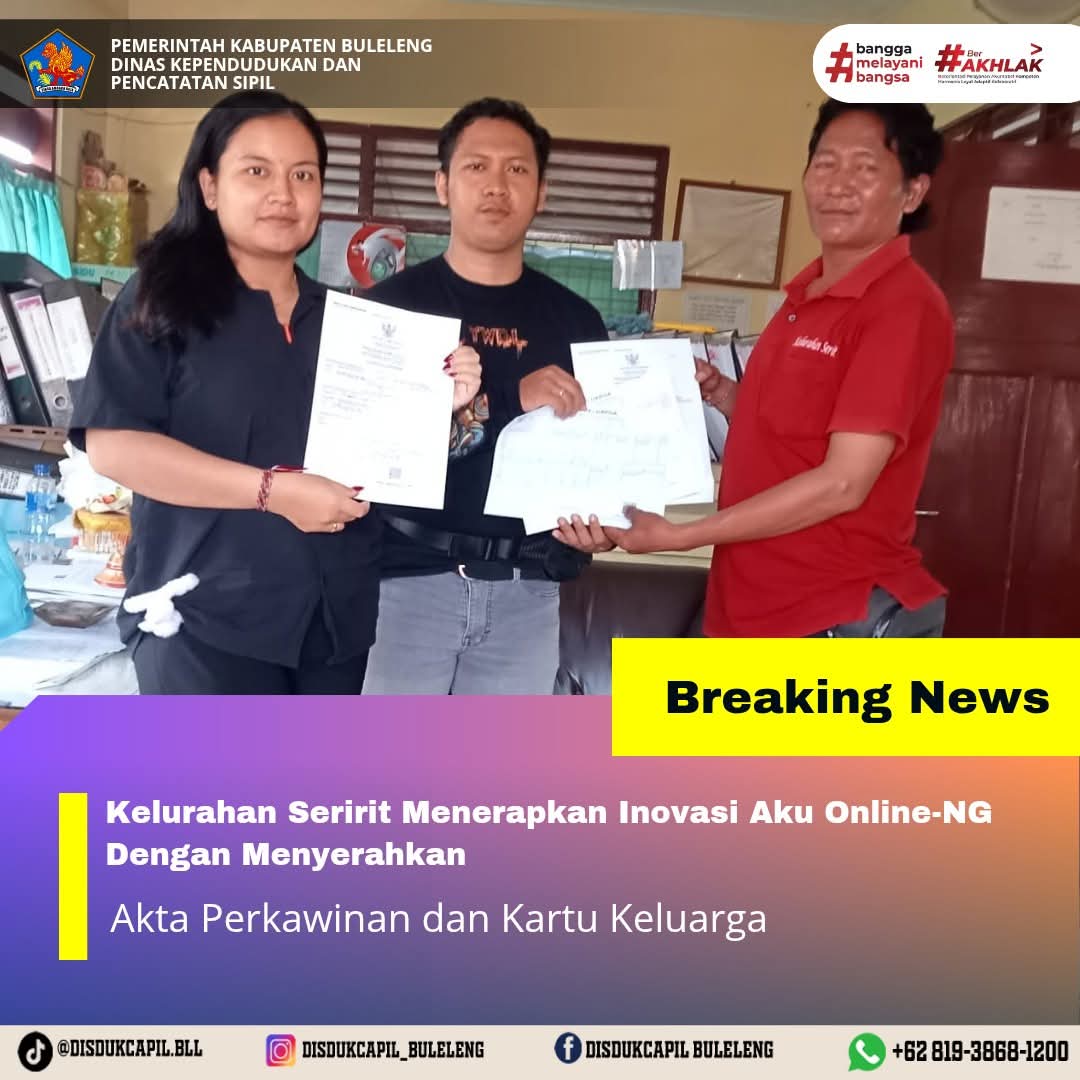 Pemerintah Kabupaten Buleleng melalui Dinas Kependudukan dan Pecatatan Sipil (Disdukcapil) Kabupaten Buleleng memaksimalkan serta mempermudah pelayanan kependudukan masyarakat dengan beberapa inovasi, melalui aplikasi AKU Online-NG. Dimana dalam penerapan aplikasi Aku Online-NG tersebut masyarakat tidak perlu lagi datang ke Dinas Dukcapil untuk melakukan pelayanan langsung cukup dengan datang ke Desa nanti akan dibantu oleh operator Desa masing-masing. Di Kelurahan Seririt Kecamatan Seririt, telah diserahkan dokumen kependudukan berupa Akta Perkawinan dan Kartu Keluarga atas nama Kade Ananda Dwiyanto yang diserahkan langsung oleh operator Kelurahan Seririt bertempat di Kantor Kelurahan Seririt, Kecamatan Seririt Kabupaten Buleleng, Jumat (21/11).