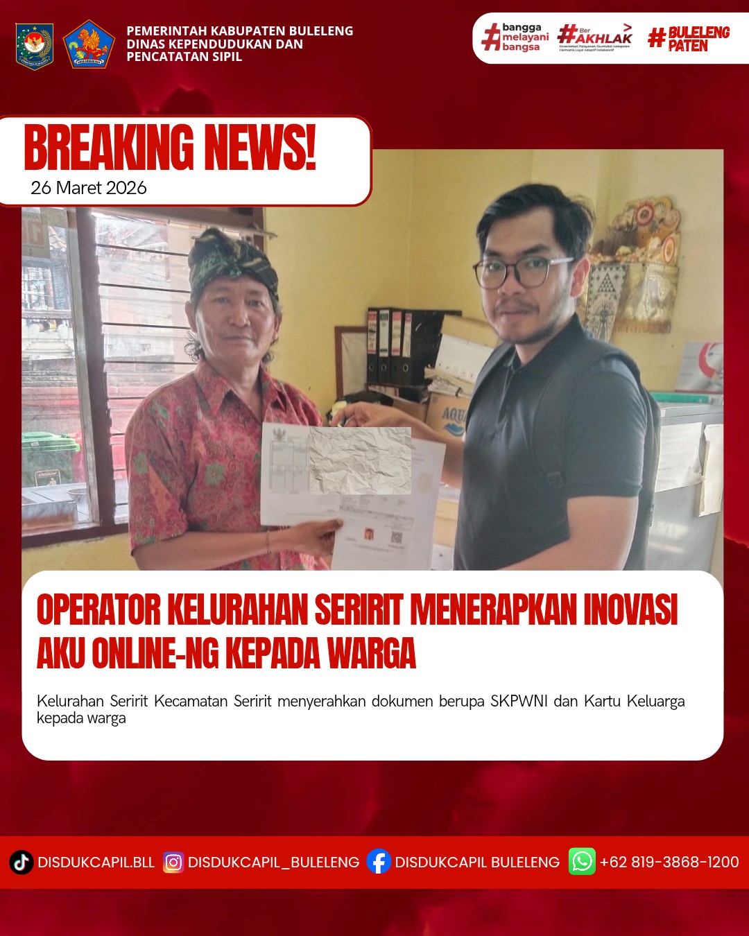 Pemerintah Kabupaten Buleleng melalui Dinas Kependudukan dan Pecatatan Sipil (Disdukcapil) Kabupaten Buleleng memaksimalkan serta mempermudah pelayanan kependudukan masyarakat dengan beberapa inovasi, melalui aplikasi AKU Online-NG. Dimana dalam penerapan aplikasi Aku Online-NG tersebut masyarakat tidak perlu lagi datang ke Dinas Dukcapil untuk melakukan pelayanan langsung, cukup dengan datang ke Desa nanti akan dibantu oleh operator Desa masing-masing. Di Kelurahan Seririt Kecamatan Seririt, telah diserahkan dokumen kependudukan berupa SKPWNI atas nama Faris Reynaldi dan Kartu Keluarga atas nama Syarifuddin yang diserahkan langsung oleh Operator Kelurahan Seririt di Kecamatan Seririt, Kabupaten Buleleng, Kamis (26/3).