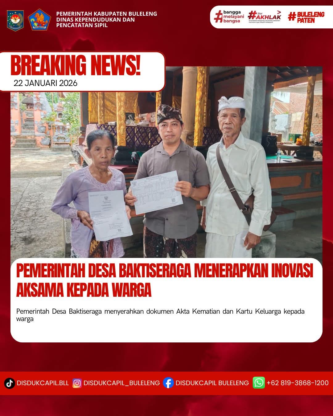 Pemerintah Kabupaten Buleleng melalui Dinas Kependudukan dan Pecatatan Sipil (Disdukcapil) Kabupaten Buleleng memaksimalkan serta mempermudah pelayanan kependudukan masyarakat dengan beberapa inovasi, yakni BALITA (Bayi Lahir Berakta), NYAKSI (Menyerahkan Akta Kawin Saat Acara Perkawinan) dan AKSAMA ( Akta Kematian Diserahkan Saat Masih Berduka) melalui aplikasi Aku Online. Di Desa Baktiseraga Kecamatan Buleleng, telah diterapkan program Aksama (Akta Kematian Diserahkan Saat Masih Berduka) yang dilakukan secara langsung oleh Kelian Banjar Dinas Seraya menyerahkan Akta Kematian dan Kartu Keluarga di Desa Baktiseraga, Kecamatan Buleleng, Kamis (22/1).