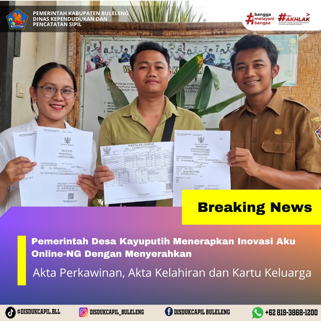 Pemerintah Kabupaten Buleleng melalui Dinas Kependudukan dan Pecatatan Sipil (Disdukcapil) Kabupaten Buleleng memaksimalkan serta mempermudah pelayanan kependudukan masyarakat dengan beberapa inovasi, melalui aplikasi AKU Online-NG. Dimana dalam penerapan aplikasi Aku Online-NG tersebut masyarakat tidak perlu lagi datang ke Dinas Dukcapil untuk melakukan pelayanan langsung cukup dengan datang ke Desa nanti akan dibantu oleh operator Desa masing-masing. Di Desa Kayuputih Kecamatan Sukasada, telah diserahkan dokumen kependudukan berupa Akta Perkawinan atas nama Gede Arik Purnawirawan dan Komang Yuliani, Akta Kelahiran atas nama Putu Revan Narendra Putra dan Kadek Arjun Agasthya Birendra dan Kartu Keluarga atas nama Gede Ari Purnawirawan yang diserahkan langsung oleh Pemerintahan Desa Kayuputih Kecamatan Sukasada bertempat di kantor Perbekel Desa Kayuputih, Kecamatan Sukasada, Kabupaten Buleleng, Senin (27/10).