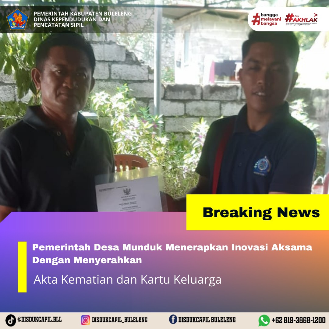 Pemerintah Kabupaten Buleleng melalui Dinas Kependudukan dan Pecatatan Sipil (Disdukcapil) Kabupaten Buleleng memaksimalkan serta mempermudah pelayanan kependudukan masyarakat dengan beberapa inovasi, yakni BALITA (Bayi Lahir Berakta), NYAKSI (Menyerahkan Akta Kawin Saat Acara Perkawinan) dan AKSAMA ( Akta Kematian Diserahkan Saat Masih Berduka) melalui aplikasi Aku Online-NG. Di Desa Munduk Bestala Kecamatan Seririt, telah diterapkan program Aksama (Akta Kematian Diserahkan Saat Masih Berduka) yang dilakukan secara langsung oleh Kelian Banjar Dinas Sari Desa Munduk Bestala Kecamatan Seririt dengan menyerahkan Akta Kematian atas nama Ketut Ayu dan Kartu Keluarga kepada keluarga almarhum di Rumah Duka di Banjar Dinas Sari Desa Munduk Bestala, Selasa (30/12).