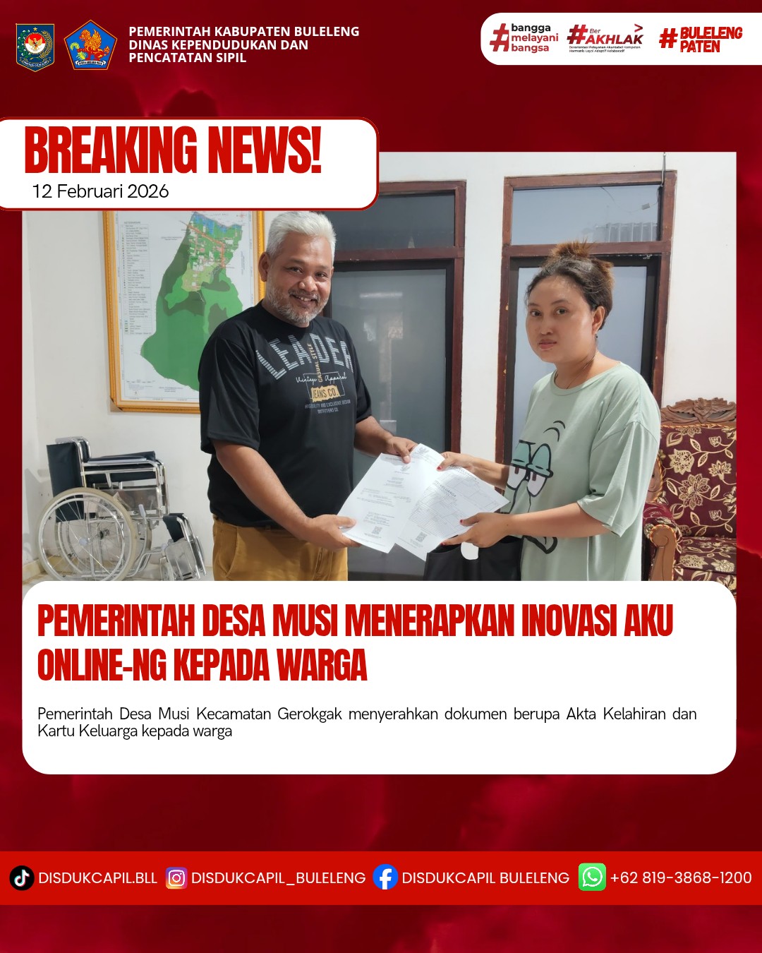 Pemerintah Kabupaten Buleleng melalui Dinas Kependudukan dan Pecatatan Sipil (Disdukcapil) Kabupaten Buleleng memaksimalkan serta mempermudah pelayanan kependudukan masyarakat dengan beberapa inovasi, melalui aplikasi AKU Online-NG. Dimana dalam penerapan aplikasi Aku Online-NG tersebut masyarakat tidak perlu lagi datang ke Dinas Dukcapil untuk melakukan pelayanan langsung cukup dengan datang ke Desa nanti akan dibantu oleh operator Desa masing-masing. Di Desa Musi Kecamatan Gerokgak, telah diserahkan dokumen kependudukan berupa Akta Kelahiran dan Kartu Keluarga yang diserahkan langsung oleh Kelian Banjar Dinas Musi Desa Musi Kecamatan Gerokgak, Kabupaten Buleleng, Kamis (12/2).