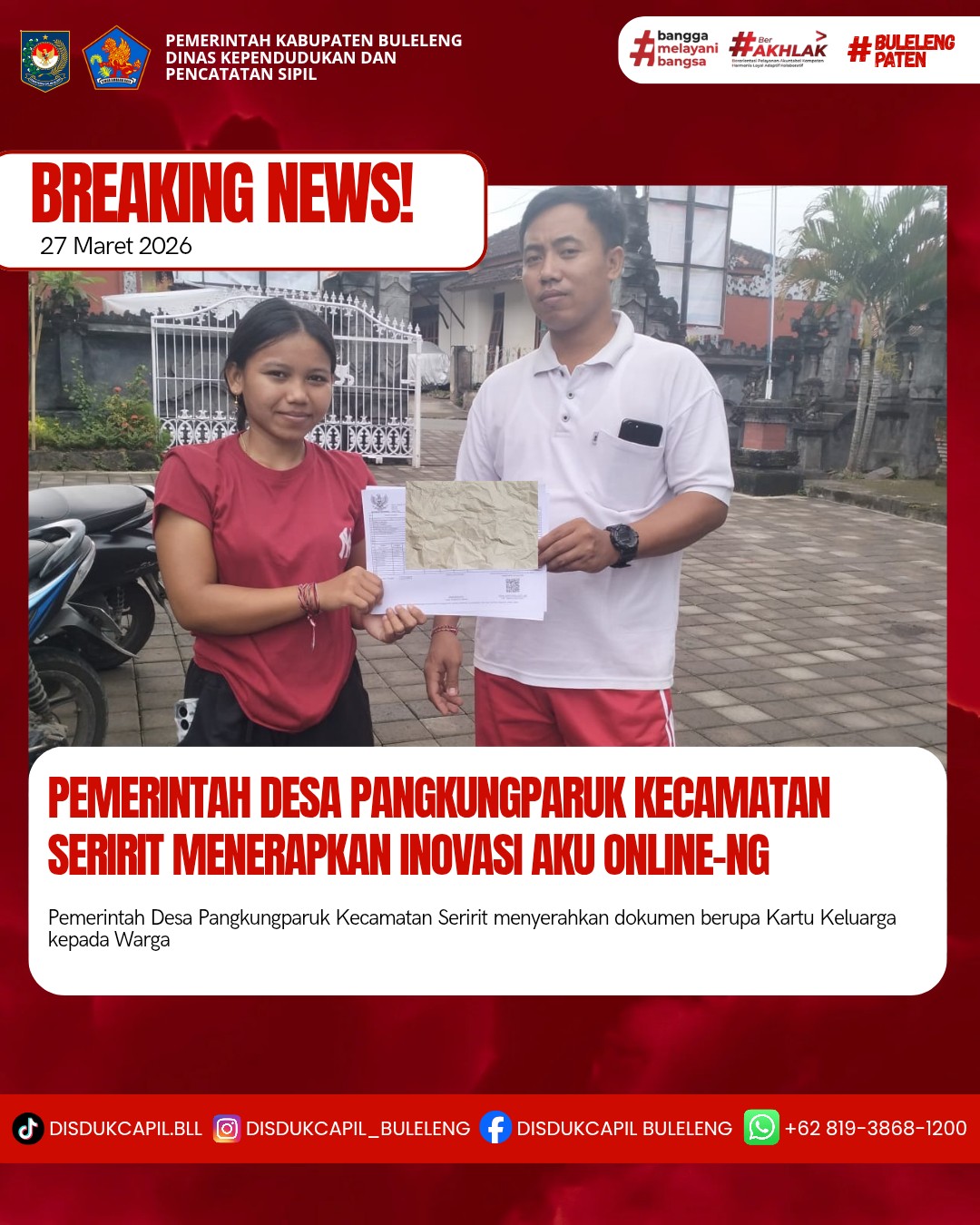 Pemerintah Kabupaten Buleleng melalui Dinas Kependudukan dan Pecatatan Sipil (Disdukcapil) Kabupaten Buleleng memaksimalkan serta mempermudah pelayanan kependudukan masyarakat dengan beberapa inovasi, melalui aplikasi AKU Online-NG. Dimana dalam penerapan aplikasi Aku Online-NG tersebut masyarakat tidak perlu lagi datang ke Dinas Dukcapil untuk melakukan pelayanan langsung, cukup dengan datang ke Desa nanti akan dibantu oleh operator Desa masing-masing. Di Desa Pangkungparuk Kecamatan Seririt, telah diserahkan dokumen kependudukan berupa Akta Perkawinan dan K artu Keluarga atas nama Putu Adi Feby Sedana dan Kadek Saniasih warga Banjar Dinas Laba Amerta Desa Pangkungparuk yang diserahkan oleh Pemerintah Desa Pangkungparuk , Jumat (27/3).