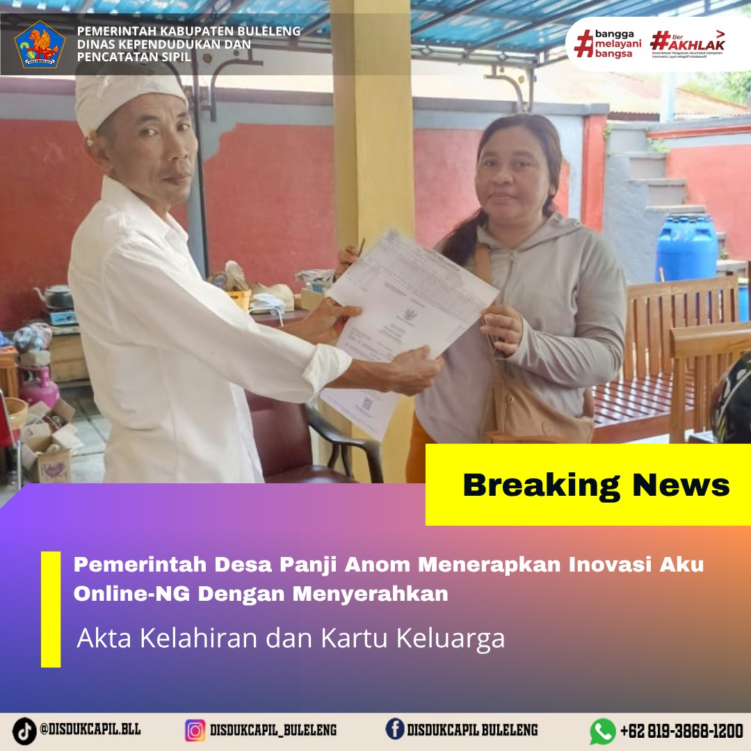 Pemerintah Kabupaten Buleleng melalui Dinas Kependudukan dan Pecatatan Sipil (Disdukcapil) Kabupaten Buleleng memaksimalkan serta mempermudah pelayanan kependudukan masyarakat dengan beberapa inovasi, melalui aplikasi AKU Online-NG. Dimana dalam penerapan aplikasi Aku Online-NG tersebut masyarakat tidak perlu lagi datang ke Dinas Dukcapil untuk melakukan pelayanan langsung cukup dengan datang ke Desa nanti akan dibantu oleh operator Desa masing-masing. Di Desa Panji Anom Kecamatan Sukasada, telah diserahkan dokumen kependudukan berupa Akta Kelahiran dan Kartu Keluarga atas nama NI KADEK ARJANI yang diserahkan secara langsung oleh Staf Desa Panji Anom bertempat di Kantor Perbekel Panji Anom, Kecamatan Sukasada, Selasa (21/10).