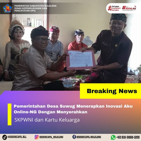 Pemerintah Kabupaten Buleleng melalui Dinas Kependudukan dan Pecatatan Sipil (Disdukcapil) Kabupaten Buleleng memaksimalkan serta mempermudah pelayanan kependudukan masyarakat dengan beberapa inovasi, melalui aplikasi AKU Online-NG. Dimana dalam penerapan aplikasi Aku Online-NG tersebut masyarakat tidak perlu lagi datang ke Dinas Dukcapil untuk melakukan pelayanan langsung cukup dengan datang ke Desa nanti akan dibantu oleh operator Desa masing-masing. Di Desa Suwug Kecamatan Sawan, telah diserahkan dokumen kependudukan berupa SKPWNI dan Kartu Keluarga oleh Kelian Banjar Dinas Desa Suwug dan diterima langsung oleh Perbekel Desa Busungbiu, Rabu (1/10).