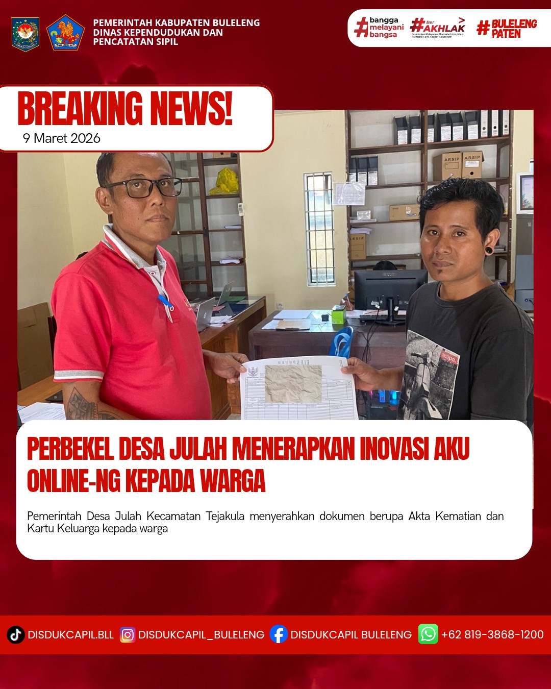 Pemerintah Kabupaten Buleleng melalui Dinas Kependudukan dan Pecatatan Sipil (Disdukcapil) Kabupaten Buleleng memaksimalkan serta mempermudah pelayanan kependudukan masyarakat dengan beberapa inovasi, melalui aplikasi AKU Online-NG. Dimana dalam penerapan aplikasi Aku Online-NG tersebut masyarakat tidak perlu lagi datang ke Dinas Dukcapil untuk melakukan pelayanan langsung cukup dengan datang ke Desa nanti akan dibantu oleh operator Desa masing-masing. Di Desa Julah Kecamatan Tejakula, telah diserahkan dokumen kependudukan berupa Akta Kematian a.n I KETUT SUNIARSA dan Kartu Keluarga a.n NI WAYAN LETRIyang beralamat di Banjar Dinas Kawanan, Desa Julah Yang diserahkan langsung oleh Perbekel Desa Julah, Senin (9/3).