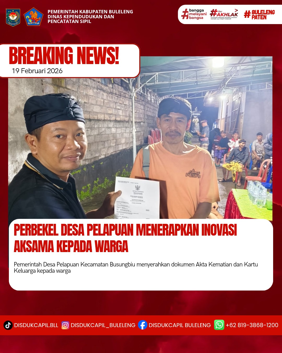 Pemerintah Kabupaten Buleleng melalui Dinas Kependudukan dan Pecatatan Sipil (Disdukcapil) Kabupaten Buleleng memaksimalkan serta mempermudah pelayanan kependudukan masyarakat dengan beberapa inovasi, yakni BALITA (Bayi Lahir Berakta), NYAKSI (Menyerahkan Akta Kawin Saat Acara Perkawinan) dan AKSAMA ( Akta Kematian Diserahkan Saat Masih Berduka) melalui aplikasi Aku Online. Di Desa Pelapuan Kecamatan Busungbiu, telah diterapkan program Aksama (Akta Kematian Diserahkan Saat Masih Berduka) yang dilakukan secara langsung oleh Perbekel Desa Pelapuan Gede Agus Armika Yasa dengan menyerahkan Akta Kematian atas nama Nengah Sutri dan Kartu Keluarga kepada keluarga almarhum di Desa Pelapuan Kecamatan Busungbiu, Kamis (19/2).