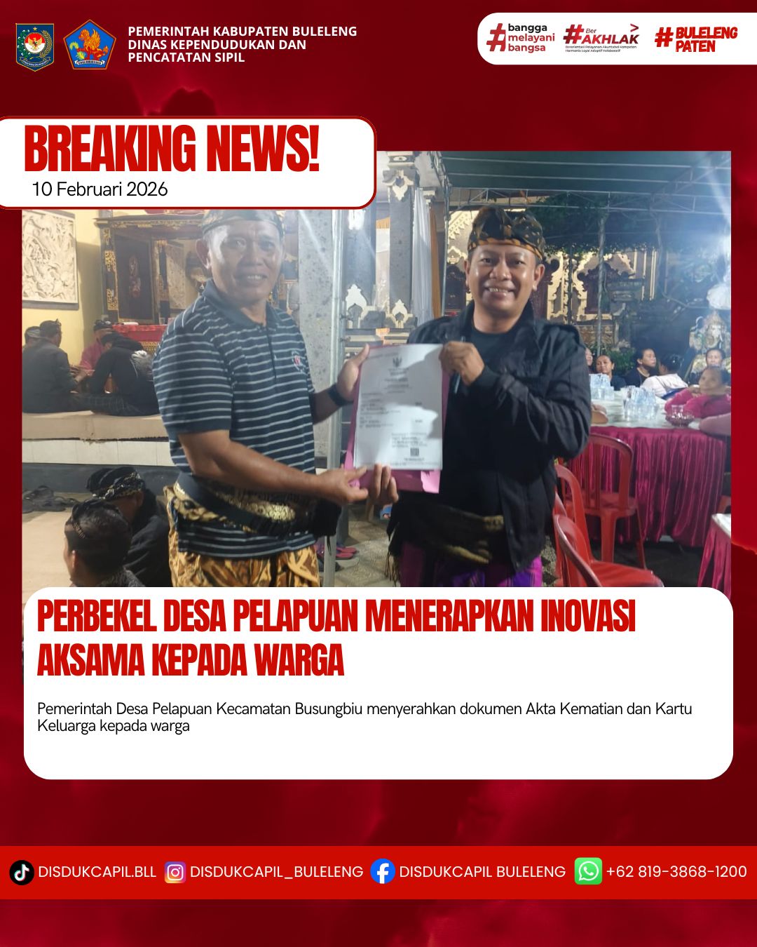 Pemerintah Kabupaten Buleleng melalui Dinas Kependudukan dan Pecatatan Sipil (Disdukcapil) Kabupaten Buleleng memaksimalkan serta mempermudah pelayanan kependudukan masyarakat dengan beberapa inovasi, yakni BALITA (Bayi Lahir Berakta), NYAKSI (Menyerahkan Akta Kawin Saat Acara Perkawinan) dan AKSAMA ( Akta Kematian Diserahkan Saat Masih Berduka) melalui aplikasi Aku Online. Di Desa Pelapuan Kecamatan Busungbiu, telah diterapkan program Aksama (Akta Kematian Diserahkan Saat Masih Berduka) yang dilakukan secara langsung oleh Perbekel Desa Pelapuan Gede Agus Armika Yasa dengan menyerahkan Akta Kematian atas nama Ketut Mundri dan Kartu Keluarga kepada keluarga almarhum di Desa Pelapuan Kecamatan Busungbiu, Selasa (10/2).