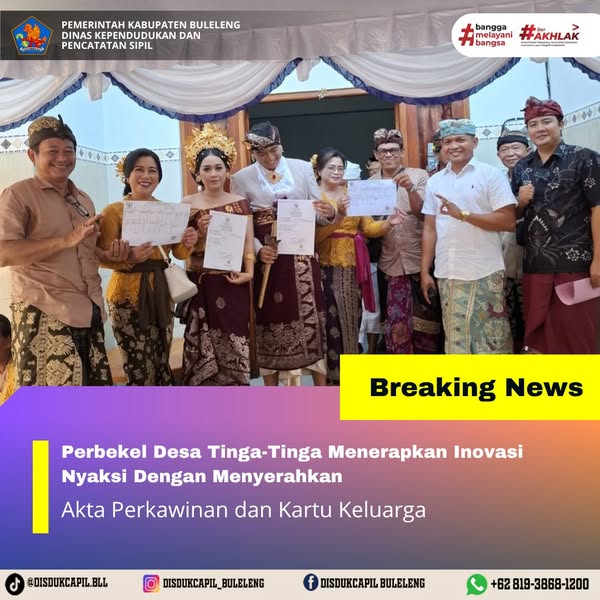 Pemerintah Kabupaten Buleleng melalui Dinas Kependudukan dan Pecatatan Sipil (Disdukcapil) Kabupaten Buleleng memaksimalkan serta mempermudah pelayanan kependudukan masyarakat dengan beberapa inovasi, yakni BALITA (Bayi Lahir Berakta), NYAKSI (Menyerahkan Akta Kawin Saat Acara Perkawinan) dan AKSAMA ( Akta Kematian Diserahkan Saat Masih Berduka) melalui aplikasi Aku Online-NG. Di Desa Kedis Kecamatan Busungbiu, telah diterapkan program NYAKSI (Menyerahkan Akta Perkawinan Saat Acara Perkawinan) yang dilakukan secara langsung oleh Perbekel Desa Tinga-Tinga dengan menyerahkan Akta Perkawinan atas nama Putu Adia Wiratmadi dan Kadek Sintya Ramayani dan Kartu Keluarga kepada kedua mempelai dan masing-masing orang tua mempelai didi Banjar Dinas Mertasari, Desa Tinga-tinga, Kecamatan Gerokgak, Rabu (8/10).