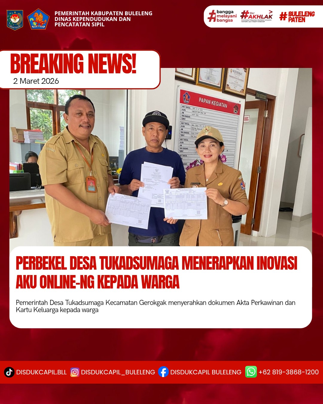 Pemerintah Kabupaten Buleleng melalui Dinas Kependudukan dan Pecatatan Sipil (Disdukcapil) Kabupaten Buleleng memaksimalkan serta mempermudah pelayanan kependudukan masyarakat dengan beberapa inovasi, melalui aplikasi AKU Online-NG. Dimana dalam penerapan aplikasi Aku Online-NG tersebut masyarakat tidak perlu lagi datang ke Dinas Dukcapil untuk melakukan pelayanan langsung cukup dengan datang ke Desa nanti akan dibantu oleh operator Desa masing-masing. Di Desa Tukadsumaga Kecamatan Gerokgak, telah diserahkan dokumen kependudukan berupa Akta Perkawinan atas nama I Made Putra Pramana Arta dan Kartu Keluarga atas nama I Made Putra Pramana Arta Dan I Nyoman Sucipta yang diserahkan oleh Perbekel Desa Tukadsumaga Anak Agung Sri Wathi didampingi oleh Kelian Banjar Dinas Buluh Ketut Artaya di Desa Tukadsumaga, Senin (2/3).