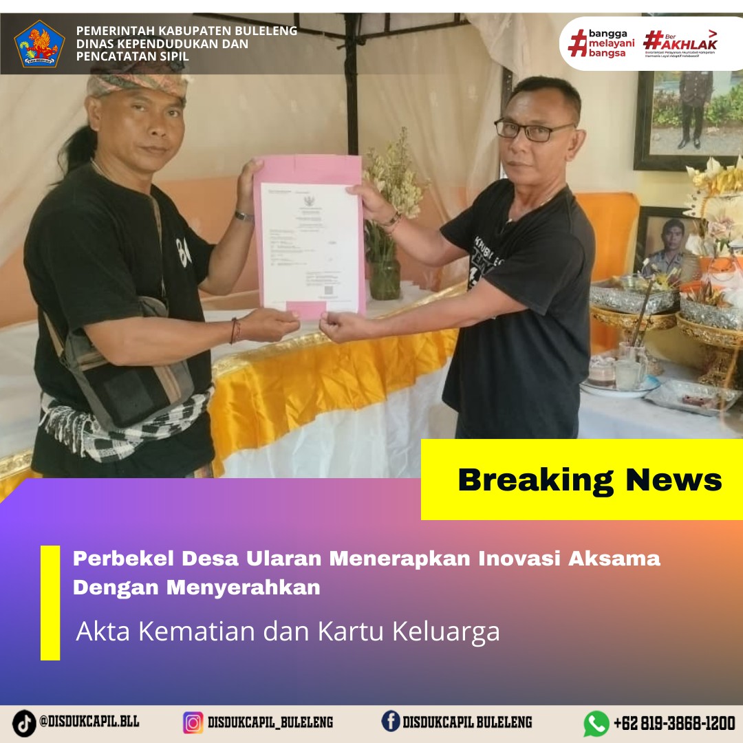 Pemerintah Kabupaten Buleleng melalui Dinas Kependudukan dan Pecatatan Sipil (Disdukcapil) Kabupaten Buleleng memaksimalkan serta mempermudah pelayanan kependudukan masyarakat dengan beberapa inovasi, yakni BALITA (Bayi Lahir Berakta), NYAKSI (Menyerahkan Akta Kawin Saat Acara Perkawinan) dan AKSAMA ( Akta Kematian Diserahkan Saat Masih Berduka) melalui aplikasi Aku Online-NG. Di Desa Ularan Kecamatan Seririt, telah diterapkan program Aksama (Akta Kematian Diserahkan Saat Masih Berduka) yang dilakukan secara langsung oleh Perbekel Desa Ularan I GUSTI NYOMAN SURYAWAN dengan menyerahkan Akta Kematian dan Kartu Keluarga di Rumah Duka Almarhum Ketut Joni Sukarta yang beralamat di Banjar Dinas Yadnya Kerthi, Desa Ularan, Kecamatan Seririt, Kabupaten Buleleng, Rabu (17/12).