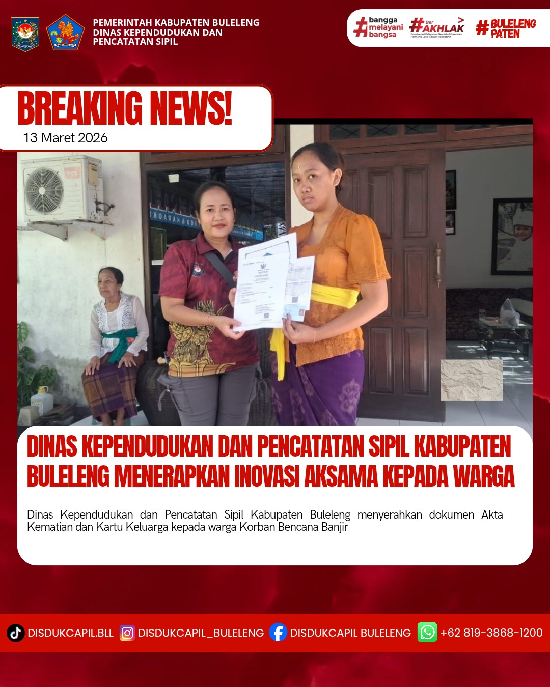 Pemerintah Kabupaten Buleleng melalui Dinas Kependudukan dan Pecatatan Sipil (Disdukcapil) Kabupaten Buleleng memaksimalkan serta mempermudah pelayanan kependudukan masyarakat dengan beberapa inovasi, yakni BALITA (Bayi Lahir Berakta), NYAKSI (Menyerahkan Akta Kawin Saat Acara Perkawinan) dan AKSAMA ( Akta Kematian Diserahkan Saat Masih Berduka) melalui aplikasi Aku Online. Dinas Kependudukan dan Pencatatan Sipil Kabupaten Buleleng telah diterapkan program Aksama (Akta Kematian Diserahkan Saat Masih Berduka) yang dilakukan secara langsung oleh Staf Dinas Kependudukan dan Pencatatan Sipil Kabupaten Buleleng dengan menyerahkan Akta Kematian dan Kartu Keluarga kepada pihak keluarga di rumah duka, Jumat (13/3).