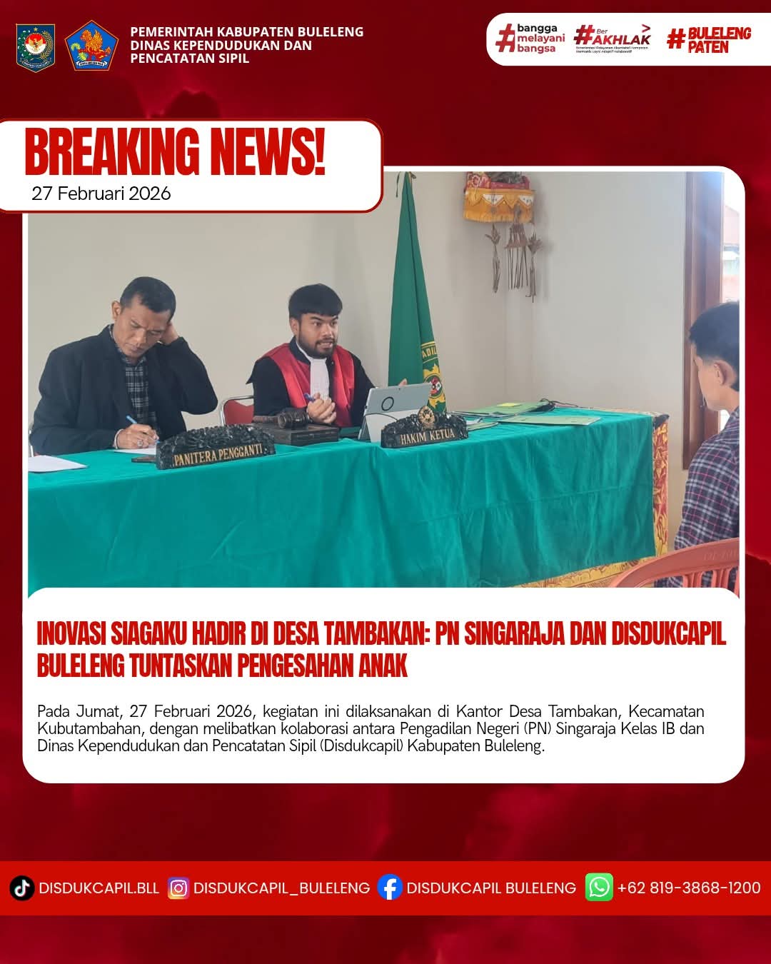 Akses keadilan dan ketertiban administrasi kependudukan kembali didekatkan ke masyarakat melalui inovasi SIAGAKU (Sidang di Luar Gedung dan Pelayanan Administrasi Kependudukan Terpadu). Pada Jumat, 27 Februari 2026, kegiatan ini dilaksanakan di Kantor Desa Tambakan, Kecamatan Kubutambahan, dengan melibatkan kolaborasi antara Pengadilan Negeri (PN) Singaraja Kelas IB dan Dinas Kependudukan dan Pencatatan Sipil (Disdukcapil) Kabupaten Buleleng.