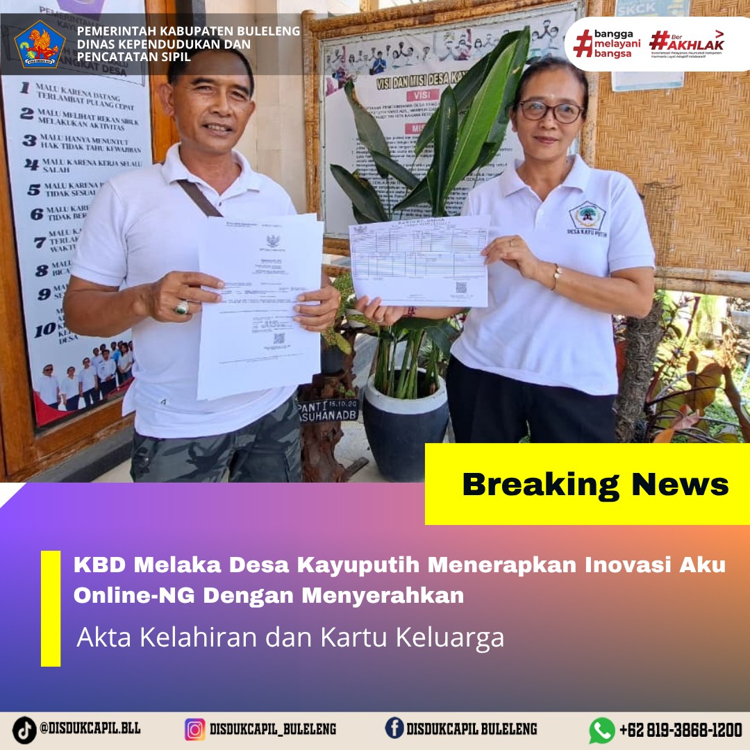 Pemerintah Kabupaten Buleleng melalui Dinas Kependudukan dan Pecatatan Sipil (Disdukcapil) Kabupaten Buleleng memaksimalkan serta mempermudah pelayanan kependudukan masyarakat dengan beberapa inovasi, melalui aplikasi AKU Online-NG. Dimana dalam penerapan aplikasi Aku Online-NG tersebut masyarakat tidak perlu lagi datang ke Dinas Dukcapil untuk melakukan pelayanan langsung cukup dengan datang ke Desa nanti akan dibantu oleh operator Desa masing-masing. Di Desa Kayuputih Kecamatan Sukasada, telah diserahkan dokumen kependudukan berupa Akta Kelahiran atas nama Kadek Sudarma dan Ketut Resni dan Kartu Keluarga atas nama Kadek Sudarma yang diserahkan langsung oleh KBD Melaka Desa Kayuputih Kecamatan Sukasada bertempat di kantor Perbekel Desa Kayuputih, Kecamatan Sukasada, Kabupaten Buleleng, Jumat (3/10).