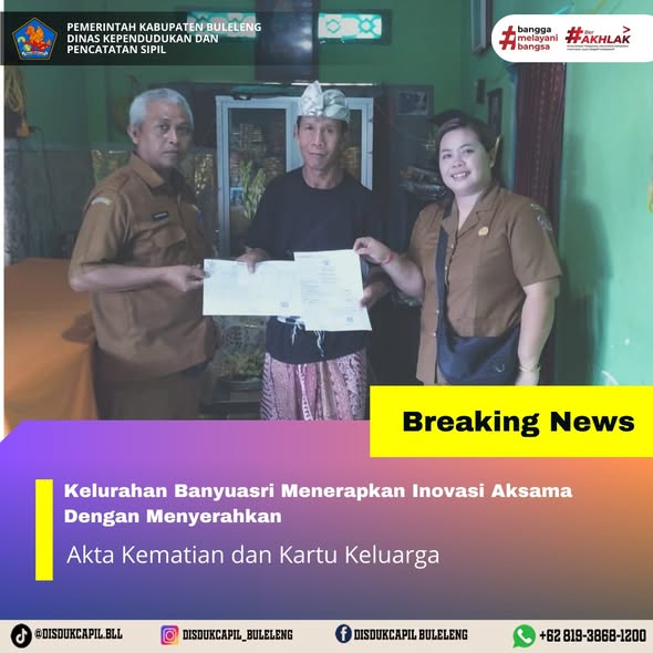 Pemerintah Kabupaten Buleleng melalui Dinas Kependudukan dan Pecatatan Sipil (Disdukcapil) Kabupaten Buleleng memaksimalkan serta mempermudah pelayanan kependudukan masyarakat dengan beberapa inovasi, yakni BALITA (Bayi Lahir Berakta), NYAKSI (Menyerahkan Akta Kawin Saat Acara Perkawinan) dan AKSAMA ( Akta Kematian Diserahkan Saat Masih Berduka) melalui aplikasi Aku Online. Di Kelurahan Banyuasri Kecamatan Buleleng, telah diterapkan program Aksama (Akta Kematian Diserahkan Saat Masih Berduka) yang dilakukan secara langsung oleh Kaling Kelurahan Banyuasri dengan menyerahkan Akta Kematian atas nama Made Mundri dan Kartu Keluarga yang beralamat di Kelurahan Banyuasri, Senin (24/11).