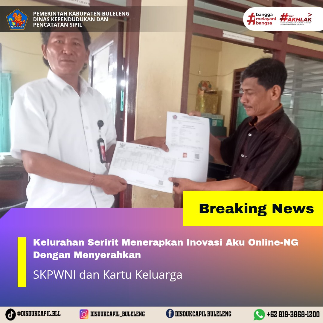 Pemerintah Kabupaten Buleleng melalui Dinas Kependudukan dan Pecatatan Sipil (Disdukcapil) Kabupaten Buleleng memaksimalkan serta mempermudah pelayanan kependudukan masyarakat dengan beberapa inovasi, melalui aplikasi AKU Online-NG. Dimana dalam penerapan aplikasi Aku Online-NG tersebut masyarakat tidak perlu lagi datang ke Dinas Dukcapil untuk melakukan pelayanan langsung cukup dengan datang ke Desa nanti akan dibantu oleh operator Desa masing-masing. Di Kelurahan Seririt Kecamatan Seririt, telah diserahkan dokumen kependudukan berupa SKPWNI atas nama Achmad Muthma'an dan Kartu Keluarga atas nama Moh. Kholidurrahman yang diserahkan langsung oleh Operator Kelurahan Seririt Kecamatan Seririt, Kabupaten Buleleng, Rabu (3/12).