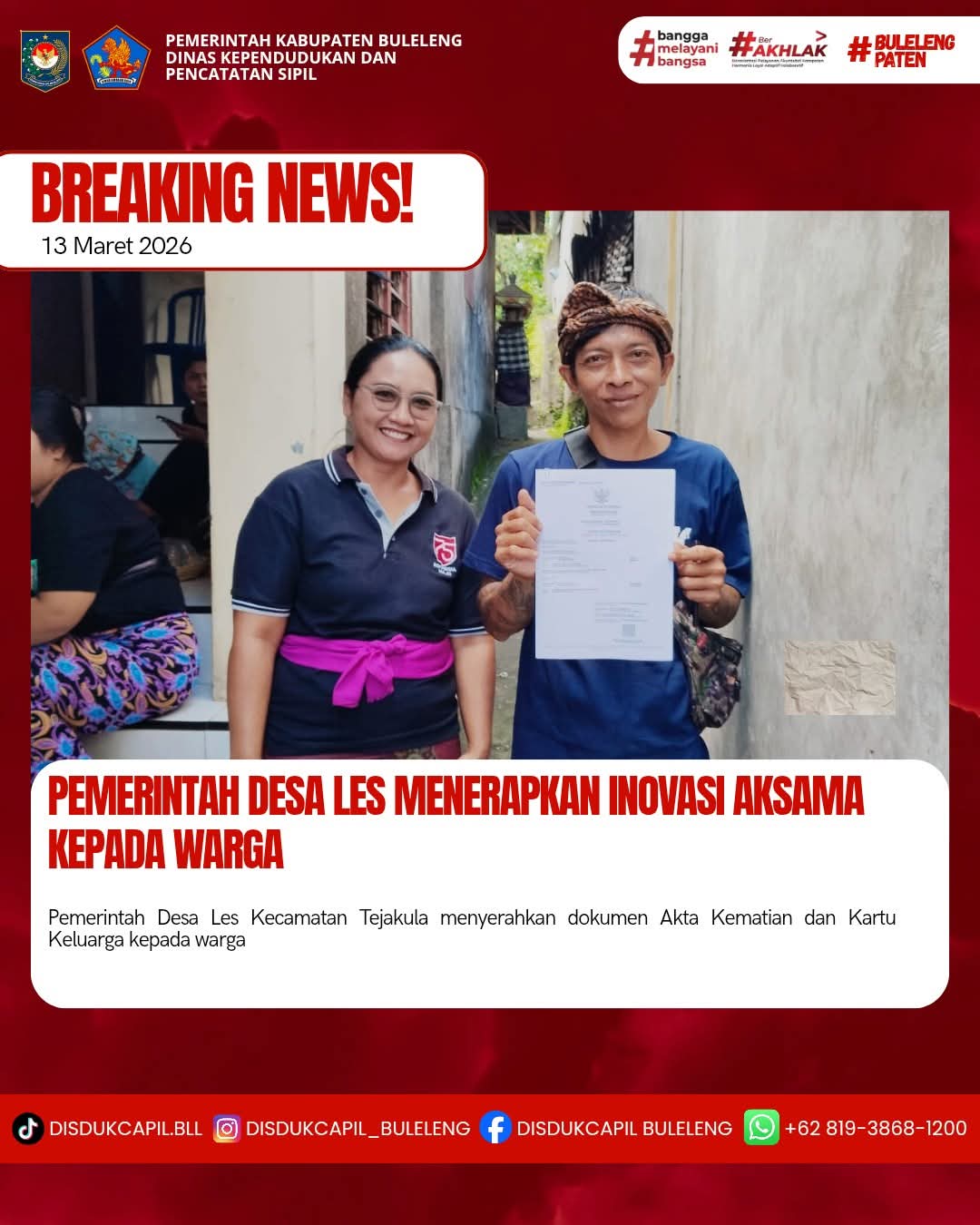 Pemerintah Kabupaten Buleleng melalui Dinas Kependudukan dan Pecatatan Sipil (Disdukcapil) Kabupaten Buleleng memaksimalkan serta mempermudah pelayanan kependudukan masyarakat dengan beberapa inovasi, yakni BALITA (Bayi Lahir Berakta), NYAKSI (Menyerahkan Akta Kawin Saat Acara Perkawinan) dan AKSAMA ( Akta Kematian Diserahkan Saat Masih Berduka) melalui aplikasi Aku Online-NG. Di Desa Les Kecamatan Tejakula, telah diterapkan program Aksama (Akta Kematian Diserahkan Saat Masih Berduka) yang dilakukan secara langsung oleh Kelian Banjar Dinas Panjingan Desa Les dengan menyerahkan Akta Kematian dan Kartu Keluarga kepada keluarga almarhum di Banjar Dinas Panjingan, Desa Les, Jumat (13/3).