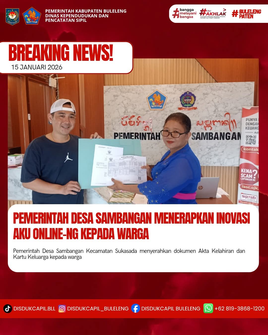 Pemerintah Kabupaten Buleleng melalui Dinas Kependudukan dan Pecatatan Sipil (Disdukcapil) Kabupaten Buleleng memaksimalkan serta mempermudah pelayanan kependudukan masyarakat dengan beberapa inovasi, melalui aplikasi AKU Online-NG. Dimana dalam penerapan aplikasi Aku Online-NG tersebut masyarakat tidak perlu lagi datang ke Dinas Dukcapil untuk melakukan pelayanan langsung cukup dengan datang ke Desa nanti akan dibantu oleh operator Desa masing-masing. Di Desa Sambangan Kecamatan Sukasada, telah diserahkan dokumen kependudukan berupa Akta Kelahiran atas nama Ida Bagus Putu Agastya Dhananjaya dan Kartu Keluarga atas nama Ida Bagus Gede Surapsara diserahkan oleh Kasi Pemerintahan Desa Sambangan bertempat di Kantor Perbekel Desa Sambangan, Kecamatan Sukasada, Kabupaten Buleleng, Kamis (15/1).