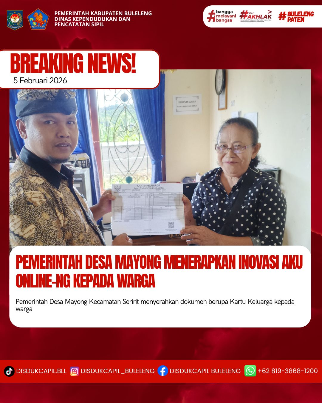 Pemerintah Kabupaten Buleleng melalui Dinas Kependudukan dan Pecatatan Sipil (Disdukcapil) Kabupaten Buleleng memaksimalkan serta mempermudah pelayanan kependudukan masyarakat dengan beberapa inovasi, melalui aplikasi AKU Online-NG. Dimana dalam penerapan aplikasi Aku Online-NG tersebut masyarakat tidak perlu lagi datang ke Dinas Dukcapil untuk melakukan pelayanan langsung cukup dengan datang ke Desa nanti akan dibantu oleh operator Desa masing-masing. Di Desa Mayong Kecamatan Seririt, telah diserahkan dokumen kependudukan berupa Kartu Keluarga atas nama Gusti Nyoman Astiti yang diserahkan langsung oleh Kasi Pemerintahan Desa Mayong bertempat di Kantor Perbekel Desa Mayong, Kecamatan Seririt, Kamis (5/2).