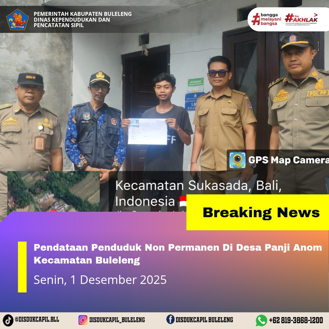 Kali ini Senin, 1 Desember 2025, Dinas Kependudukan dan Pencatatan Sipil Kabupaten Buleleng melaksanakan kegiatan pendataan penduduk Non Permanen di Desa Panji Anom Kecamatan Sukasada. Dari pendataan penduduk kali ini didapatkan hasil :