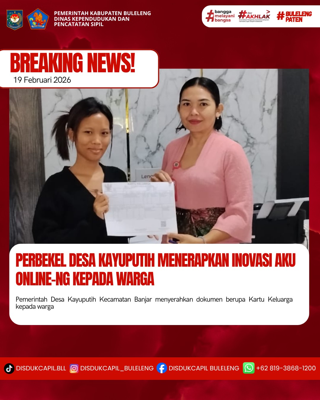 Pemerintah Kabupaten Buleleng melalui Dinas Kependudukan dan Pecatatan Sipil (Disdukcapil) Kabupaten Buleleng memaksimalkan serta mempermudah pelayanan kependudukan masyarakat dengan beberapa inovasi, melalui aplikasi AKU Online-NG. Dimana dalam penerapan aplikasi Aku Online-NG tersebut masyarakat tidak perlu lagi datang ke Dinas Dukcapil untuk melakukan pelayanan langsung cukup dengan datang ke Desa nanti akan dibantu oleh operator Desa masing-masing. Di Desa Kayuputih Kecamatan Banjar, telah diserahkan dokumen kependudukan berupa Kartu Keluarga atas nama Gusti Putu Harumwarga Desa Kayuputih yang diserahkan oleh Perbekel Desa Kayuputih Kecamatan Banjar Kadek Dina Nuriani bertempat di Kantor Perbekel Desa Kayuputih, Kecamatan Banjar, Kabupaten Buleleng, Kamis (19/2).