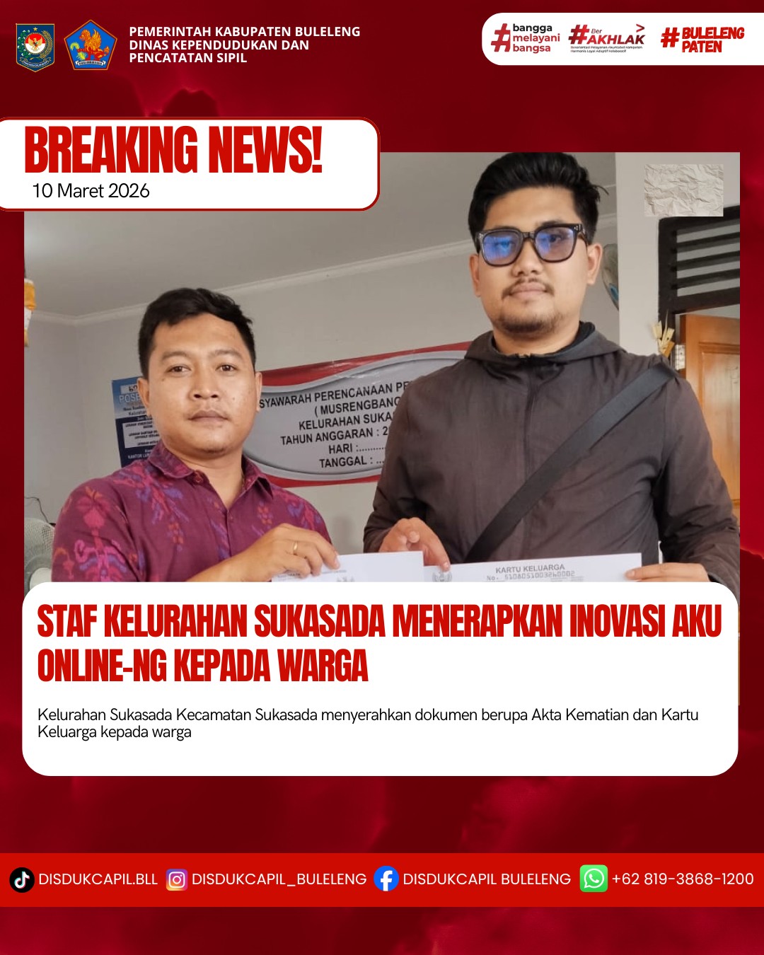 Pemerintah Kabupaten Buleleng melalui Dinas Kependudukan dan Pecatatan Sipil (Disdukcapil) Kabupaten Buleleng memaksimalkan serta mempermudah pelayanan kependudukan masyarakat dengan beberapa inovasi, melalui aplikasi AKU Online-NG. Dimana dalam penerapan aplikasi Aku Online-NG tersebut masyarakat tidak perlu lagi datang ke Dinas Dukcapil untuk melakukan pelayanan langsung cukup dengan datang ke Desa nanti akan dibantu oleh operator Desa masing-masing. Di Kelurahan Sukasada Kecamatan Sukasada, telah diserahkan dokumen kependudukan berupa Akta Kematian dan Kartu Keluarga atas nama Ni Nyoman Karsini warga Lingkungan Bantangbanua, Kelurahan Sukasada yang diserahkan langsung oleh Staf Kelurahan Sukasada Kecamatan Sukasada, Kabupaten Buleleng, Selasa (10/3).
