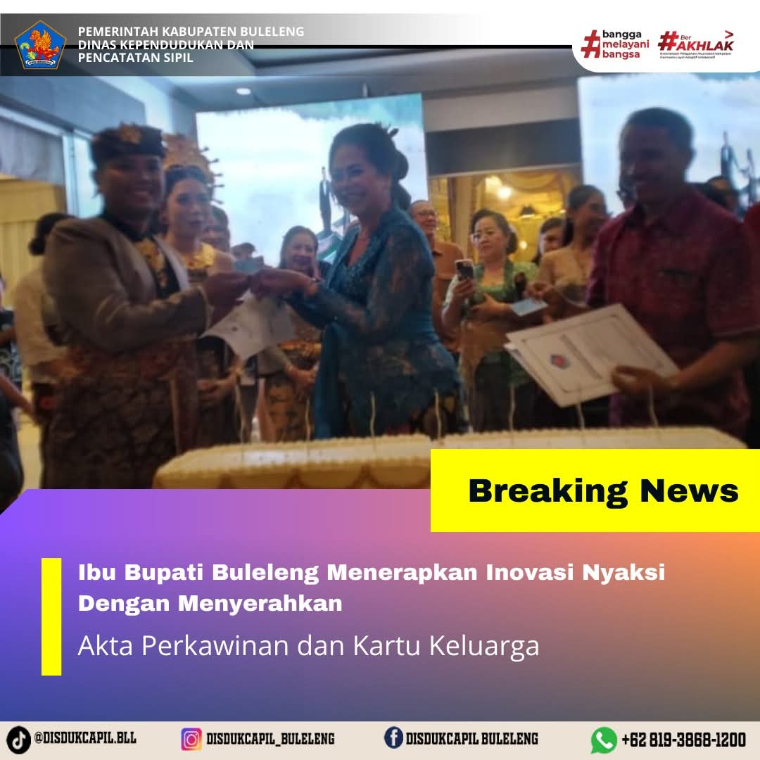 Pemerintah Kabupaten Buleleng melalui Dinas Kependudukan dan Pecatatan Sipil (Disdukcapil) Kabupaten Buleleng memaksimalkan serta mempermudah pelayanan kependudukan masyarakat dengan beberapa inovasi, yakni BALITA (Bayi Lahir Berakta), NYAKSI (Menyerahkan Akta Kawin Saat Acara Perkawinan) dan AKSAMA ( Akta Kematian Diserahkan Saat Masih Berduka) melalui aplikasi Aku Online-NG. Di Desa Panji Kecamatan Sukasada, telah diterapkan program NYAKSI (Menyerahkan Akta Kawin Saat Acara Perkawinan) yang dilakukan secara langsung oleh Ibu Bupati Buleleng Ny. Ayu Wardhani Sutjidra beserta Kepala Bidang Pelayanan dan Pencatatan Sipil Disdukcapil Buleleng dengan menyerahkan akta perkawinan dan kartu keluarga kepada kedua mempelai atas nama Dewa Made Dedy Pranata dengan Putu Deanthi Maudi Putri di Desa Panji Kecamatan Sukasada Kabupaten Buleleng. Selain kartu keluarga mempelai diserahkan juga kartu keluarga masing-masing orang tua mempelai, Senin (29/12).