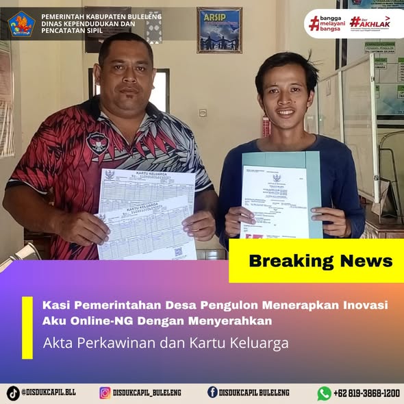 Pemerintah Kabupaten Buleleng melalui Dinas Kependudukan dan Pecatatan Sipil (Disdukcapil) Kabupaten Buleleng memaksimalkan serta mempermudah pelayanan kependudukan masyarakat dengan beberapa inovasi, melalui aplikasi AKU Online-NG. Dimana dalam penerapan aplikasi Aku Online-NG tersebut masyarakat tidak perlu lagi datang ke Dinas Dukcapil untuk melakukan pelayanan langsung cukup dengan datang ke Desa nanti akan dibantu oleh operator Desa masing-masing. Di Desa Pengulon Kecamatan Gerokgak, telah diserahkan dokumen kependudukan berupa Akta Perkawinan atas nama I Made Surya Dharma dan Kartu Keluarga atas nama I Nyoman Segara yang diserahkan secara langsung oleh Kasi Pemerintahan Desa Pengulon Kecamatan Gerokgak, Jumat (5/12).