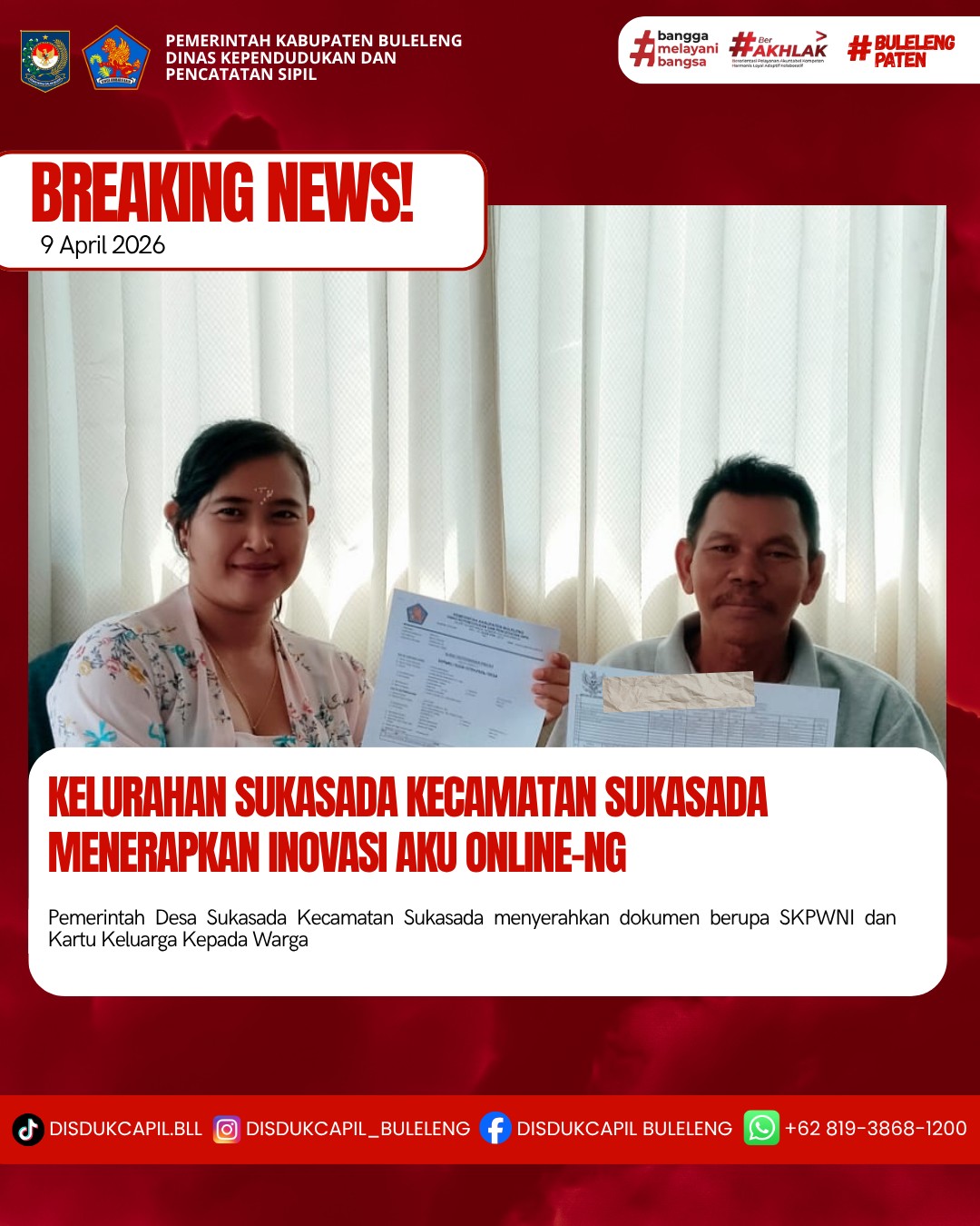 Pemerintah Kabupaten Buleleng melalui Dinas Kependudukan dan Pecatatan Sipil (Disdukcapil) Kabupaten Buleleng memaksimalkan serta mempermudah pelayanan kependudukan masyarakat dengan beberapa inovasi, melalui aplikasi AKU Online-NG. Dimana dalam penerapan aplikasi Aku Online-NG tersebut masyarakat tidak perlu lagi datang ke Dinas Dukcapil untuk melakukan pelayanan langsung cukup dengan datang ke Desa nanti akan dibantu oleh operator Desa masing-masing. Di Kelurahan Sukasada Kecamatan Sukasada, telah diserahkan dokumen kependudukan berupa SKPWNI dan Kartu Keluarga atas nama I Gusti Bagus Suyasa warga Lingkungan Sukasada, Kelurahan Sukasada yang diserahkan langsung oleh Operator Kelurahan Sukasada Kecamatan Sukasada, Kabupaten Buleleng, Kamis (9/4).