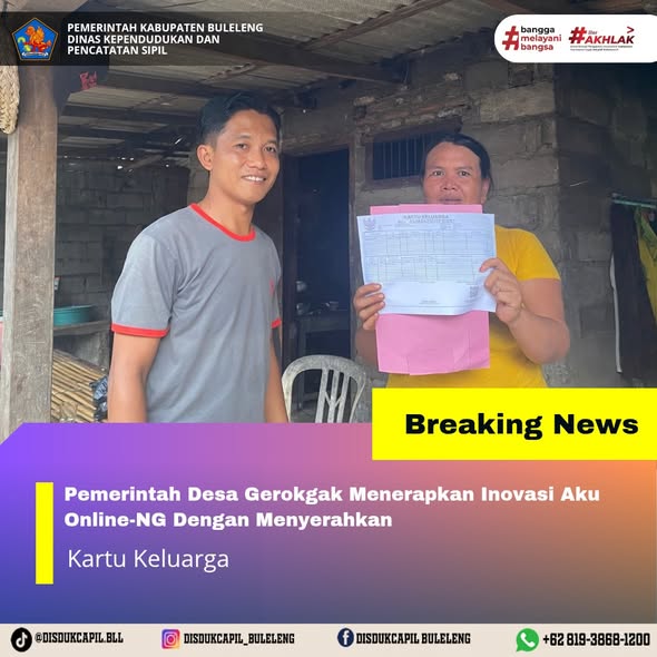 Pemerintah Kabupaten Buleleng melalui Dinas Kependudukan dan Pecatatan Sipil (Disdukcapil) Kabupaten Buleleng memaksimalkan serta mempermudah pelayanan kependudukan masyarakat dengan beberapa inovasi, melalui aplikasi AKU Online. Dimana dalam penerapan aplikasi Aku Online tersebut masyarakat tidak perlu lagi datang ke Dinas Dukcapil untuk melakukan pelayanan langsung cukup dengan datang ke Desa nanti akan dibantu oleh operator Desa masing-masing. Di Desa Gerokgak Kecamatan Gerokgak telah diserahkan dokumen kependudukan berupa Kartu Keluarga atas nama Komang Sukreni yang diserahkan langsung oleh Kelian Banjar Dinas Pucaksari, Desa Gerokgak, Senin (3/11).