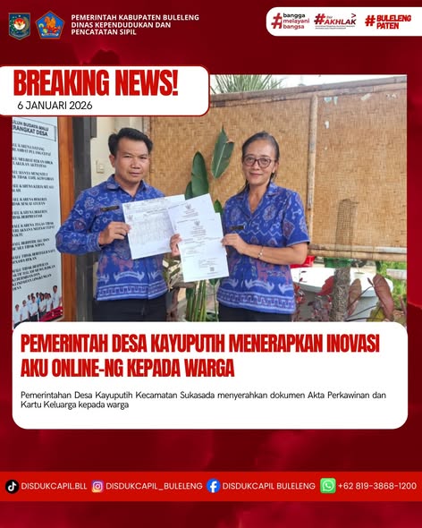Pemerintah Kabupaten Buleleng melalui Dinas Kependudukan dan Pecatatan Sipil (Disdukcapil) Kabupaten Buleleng memaksimalkan serta mempermudah pelayanan kependudukan masyarakat dengan beberapa inovasi, melalui aplikasi AKU Online-NG. Dimana dalam penerapan aplikasi Aku Online-NG tersebut masyarakat tidak perlu lagi datang ke Dinas Dukcapil untuk melakukan pelayanan langsung cukup dengan datang ke Desa nanti akan dibantu oleh operator Desa masing-masing. Di Desa Kayuputih Kecamatan Sukasada, telah diserahkan dokumen kependudukan berupa Akta Perkawinan atas nama Nengah Sumardika dengan Luh Mila Yuliantini dan Kartu Keluarga atas nama Nengah Sumardika dan Nyoman Sukita, Banjar Dinas Melaka, Desa Kayu Putih, Kecamatan Sukasada yang diserahkan secara langsung oleh Kasi Pemerintahan Desa Kayuputih Kecamatan Sukasada, Selasa (6/1).