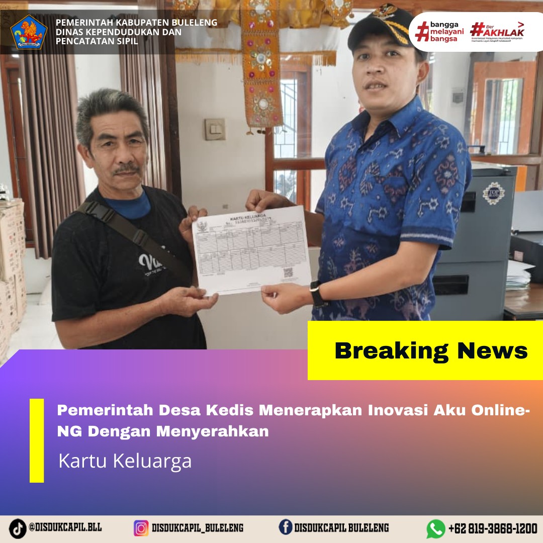 Pemerintah Kabupaten Buleleng melalui Dinas Kependudukan dan Pecatatan Sipil (Disdukcapil) Kabupaten Buleleng memaksimalkan serta mempermudah pelayanan kependudukan masyarakat dengan beberapa inovasi, melalui aplikasi AKU Online-NG. Dimana dalam penerapan aplikasi Aku Online-NG tersebut masyarakat tidak perlu lagi datang ke Dinas Dukcapil untuk melakukan pelayanan langsung cukup dengan datang ke Desa nanti akan dibantu oleh operator Desa masing-masing. Di Desa Kedis Kecamatan Busungbiu, telah diserahkan dokumen kependudukan berupa Kartu keluarga kepada warga atas nama I Nengah Saba di Banjar Dinas Kaja Desa Kedis, Kecamatan Busungbiu, yang diserahkan langsung oleh Kasi Pemerintahan Desa Kedis Kadek Dita Yudistira, Selasa (9/12).