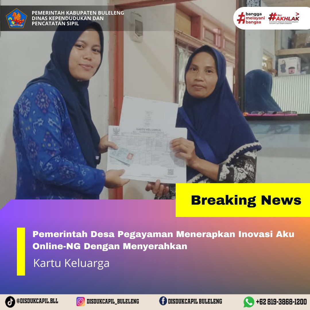 Pemerintah Kabupaten Buleleng melalui Dinas Kependudukan dan Pecatatan Sipil (Disdukcapil) Kabupaten Buleleng memaksimalkan serta mempermudah pelayanan kependudukan masyarakat dengan beberapa inovasi, melalui aplikasi AKU Online-NG. Dimana dalam penerapan aplikasi Aku Online-NG tersebut masyarakat tidak perlu lagi datang ke Dinas Dukcapil untuk melakukan pelayanan langsung cukup dengan datang ke Desa nanti akan dibantu oleh operator Desa masing-masing. Di Desa Pegayaman Kecamatan Sukasada, telah diserahkan dokumen kependudukan berupa Kartu Keluarga karena perubahan data kepada warga atas nama Muhammad Rodina yang beralamat di Banjar Dinas Barat Jalan Desa Pegayaman yang diserahkan langsung oleh Kasi Pemerintahan Desa Pegayaman, Selasa (9/12).