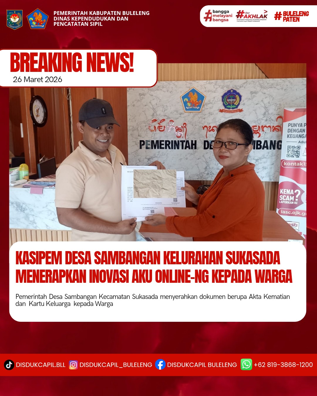 Pemerintah Kabupaten Buleleng melalui Dinas Kependudukan dan Pecatatan Sipil (Disdukcapil) Kabupaten Buleleng memaksimalkan serta mempermudah pelayanan kependudukan masyarakat dengan beberapa inovasi, melalui aplikasi AKU Online-NG. Dimana dalam penerapan aplikasi Aku Online-NG tersebut masyarakat tidak perlu lagi datang ke Dinas Dukcapil untuk melakukan pelayanan langsung, cukup dengan datang ke Desa nanti akan dibantu oleh operator Desa masing-masing. Di Desa Sambangan Kecamatan Sukasada, telah diserahkan dokumen kependudukan berupa Akta Kematian atas nama Gede Pasek dan Kartu Keluarga atas nama Komang Suryaningsih warga BD. Babakan diserahkan oleh Kasi Pemerintahan Desa Sambangan yang bertempat di Kantor Perbekel Desa Sambangan, Kecamatan Sukasada, Kabupaten Buleleng, Kamis (26/3).